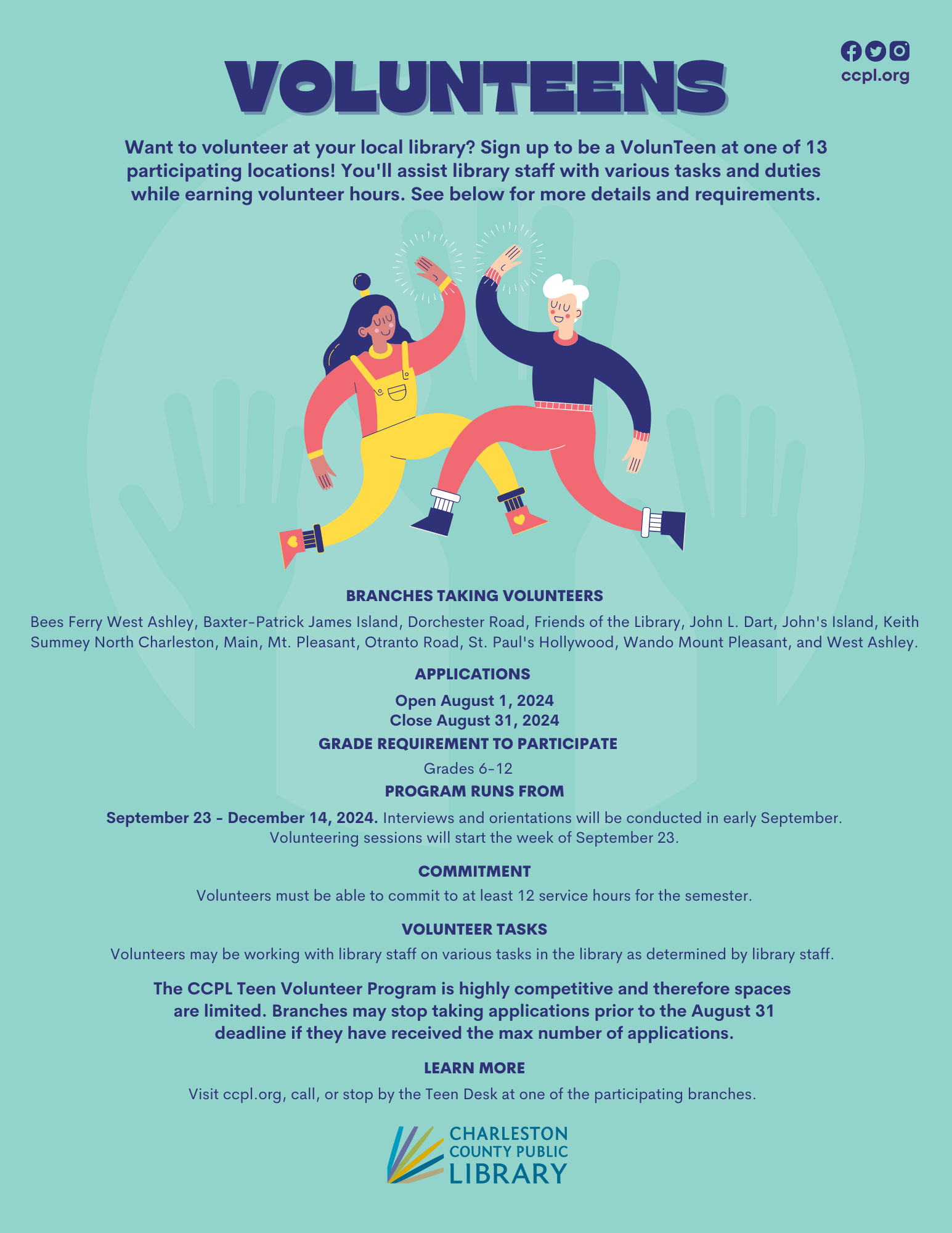 The CCPL Teen Volunteer Program is highly competitive and therefore spaces are limited. Branches may stop taking applications prior to the August 31 deadline if they have received the max number of applications. To learn more, visit ccpl.org, call, or stop by the Teen Desk at one of the participating branches.