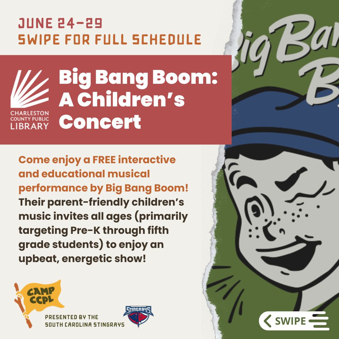Come enjoy a FREE interactive and educational musical performance by Big Bang Boom! Their parent-friendly children’s music invites all ages (primarily targeting Pre-K through fifth-grade students) to enjoy an upbeat, energetic show!
