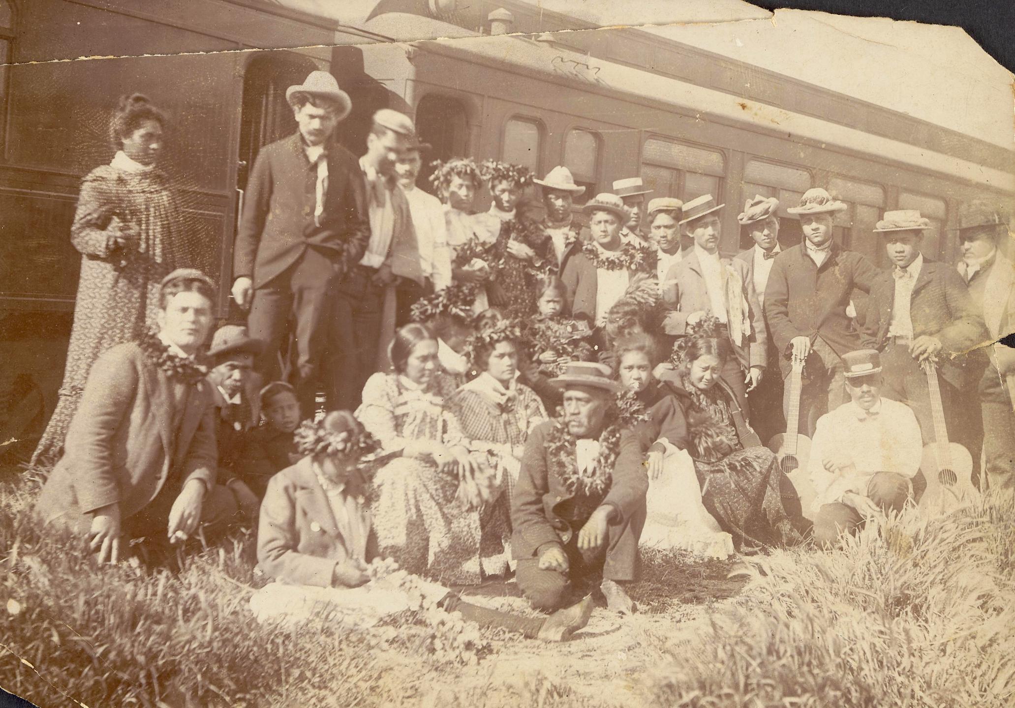 The Hawaiian band of 1901 posed next to their train in California, from the Digital Archives of Hawai’i.