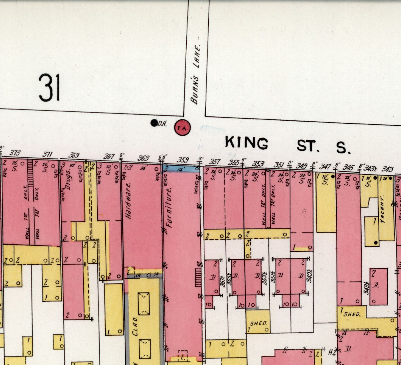 1902 edition of the Sanborn fire insurance map of Charleston, page 41 (detail), showing a range of buildings on the west side of King Street, opposite Burns Lane. The “store” in which the visiting Hawaiian band performed in the winter of 1901–2 was somewhere within this vicinity.