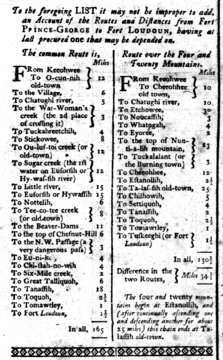 [1] These two routes are described in detail in a column of the South Carolina Gazette, 28 June–5 July 1760 (see illustration on this page). Daniel J. Tortora, Carolina in Crisis: Cherokees, Colonists, and Slaves in the American Southeast, 1756–1763 (Chapel Hill: University of North Carolina Press, 2015), 96, says the distance between Fort Loudon and Fort Prince George was 150 miles, and that Abraham made this journey in “just over a week.” The brief description of Abraham’s journey in South Carolina Gazette, 9–16 February 1760, suggests that he arrived at the latter fort on 2 February.