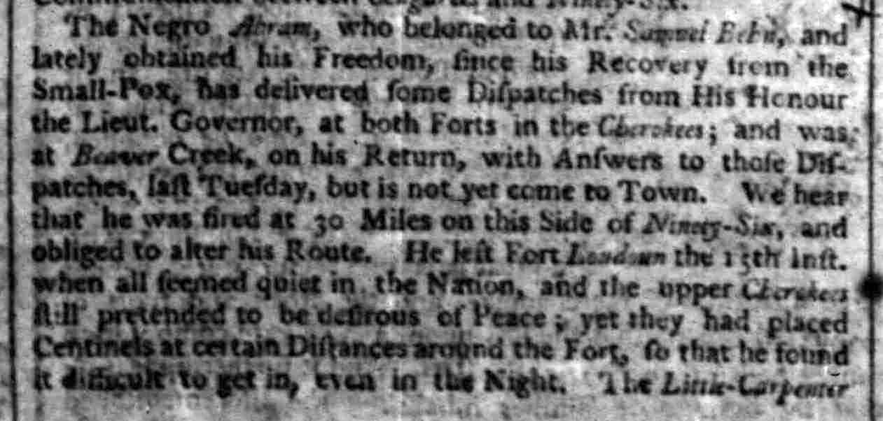 “Mr. Speaker and Gentlemen, When the Cherokees broke out war with this Province [in January of 1760], Captain [Paul] Demeré of Fort Loudoun thinking it his duty to acquaint the governor with the approaching distress to which the fort and garrison under his command was likely to be reduced, after he had in vain attempted to acquaint the governor of Virginia, the two messengers sent by him, for that purpose, being taken and one killed, promised to a Negro, named Abram [Abraham], the property of Mr. Samuel Behn [or Benn], formerly an Indian trader, and now a guide in Colonel Montgomery’s army, to endeavour [sic] to obtain his freedom, as a reward, if he would undertake to carry letters from him to the governor of this province. In the execution of which he was to pass through the whole Cherokee Nation. This service he faithfully did perform. And, after having the small-pox in Charles Town, he, with great danger and fidelity, carried letters from me to Fort Prince George and Fort Loudoun, and returned with answers last week. Therefore, in order to excite others in his condition to undertake the like dangerous and necessary services, in hopes of the like great reward; I recommend the merits of the said Negro Abram to your consideration, and desire that you would provide a suitable [monetary] satisfaction to his master for his freedom accordingly.”