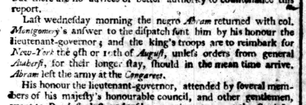 [10] Tortora, Carolina in Crisis, 129, states that Abram (Abraham) carried a letter from Lt. Gov. Bull begging Montgomery to stay and finish the job. No record survives of the precise timing of Abraham’s departure from Charleston and arrival at Colonel Montgomery’s camp. The dates of 15 and 18 July are based from estimates informed by the duration of his previous trips and by the confirmed date of Abraham’s return to Charleston on 23 July 1760.