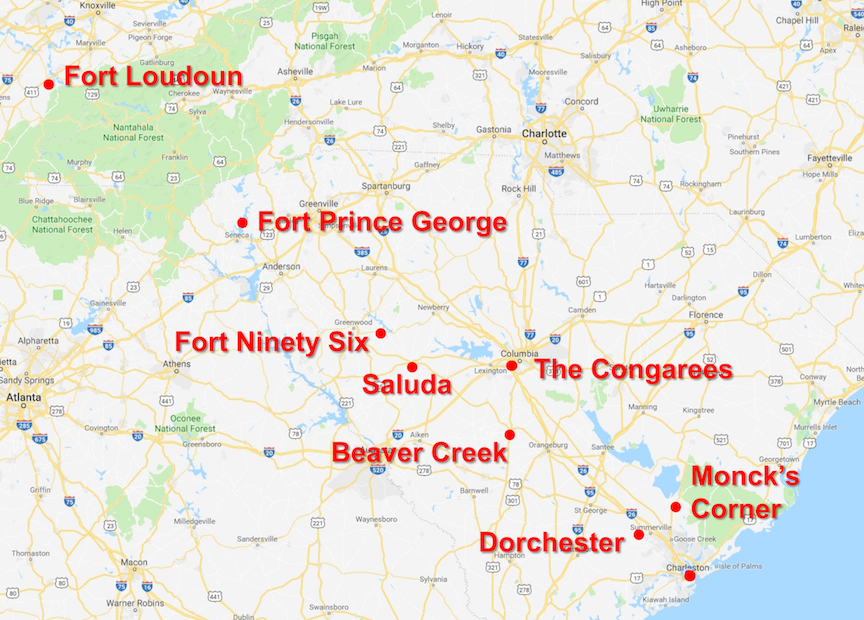 The motivations behind the massacre at Cane Creek have remained unclear since that bloody day in the summer of 1760. Conflicting reports about Indian rivalries, revenge for previous wrongs, and misunderstandings about the terms of surrender have clouded our understanding of the event from the moment it was first reported, and it’s difficult to separate conjecture from the facts in surviving accounts. Regardless of the true causes of that violent episode, or the exact number of casualties, we know that the survivors from the garrison of Fort Loudoun were scattered among the Cherokee nation after the attack on August 10th. There were no able-bodied witnesses to carry word of the event back to Fort Prince George, or any other distant colonial settlement. It took several weeks for news of the massacre to reach the network of colonial outposts that stretched across South Carolina from Fort Prince George to Charleston.