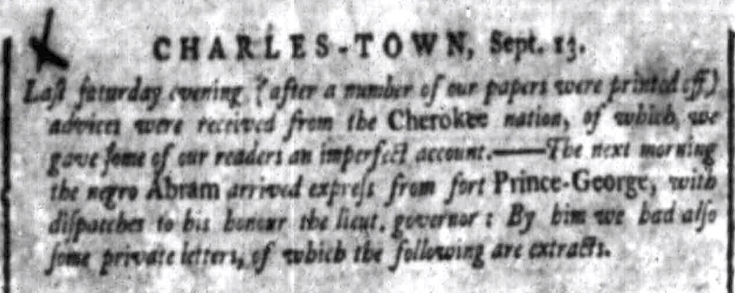 About twelve hours after the Charleston newspaper printed the first news of the fate of the Fort Loudoun garrison, Abraham galloped into the capital on the morning of Sunday, September 7th, under “gloomy” skies and with a “brisk gale” blowing in his face. He delivered his “dispatches to his honor the lieut[enant]. governor,” and distributed “some private letters” to their recipients as well.[16] Abraham had been on the frontier for five troublesome weeks, and was supposed to have reached the garrison at Fort Loudoun. Now that he had returned with news of the loss of those men and women, and threats of an escalating war, I suspect that Abraham had the full attention of the lieutenant governor. Bull likely interrogated the now-familiar black courier in an effort to understand better the latest developments on the frontlines of the Cherokee war, but no details of the conversation survive. Having completed his ninth express mission for the provincial government, Abraham no doubt found a comfortable resting place somewhere in the bustling port town, pulled off his bullet-riddled boots, and enjoyed a bit of well-deserved relaxation.