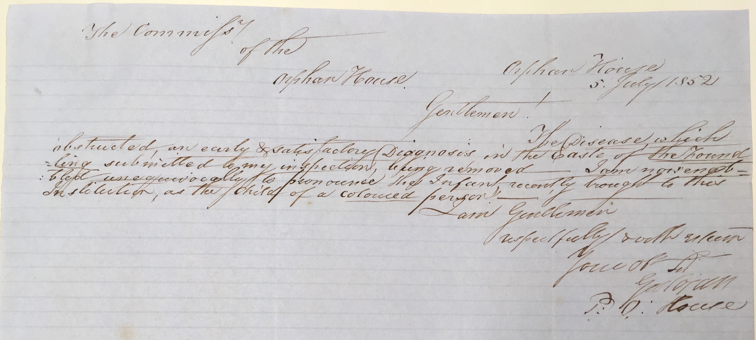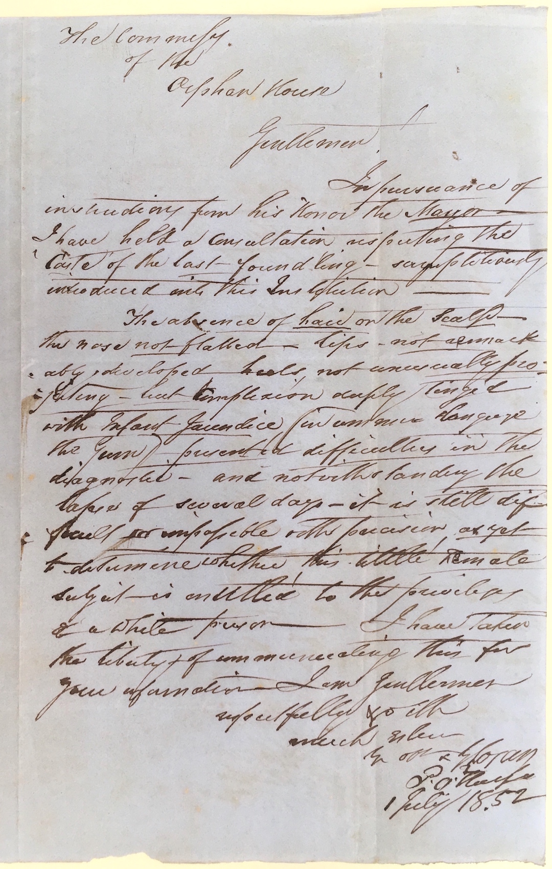 The board of commissioners of the Charleston Orphan House learned of this situation when they gathered for a regular meeting on the afternoon of July 1st. Later that same day, George Logan penned a brief report to the board summarizing his preliminary thoughts on the matter of infant girl. “In pursuance of instructions from his Honor the Mayor,” reported Dr. Logan, “I have held a consultation respecting the caste of the last foundling—surreptitiously introduced into this institution.” He noted that the infant exhibited certain features that, in his professional opinion, were typically Caucasian, including “the absence of hair on the scalp, the nose not flatted, lips not remarkably developed, [and her] heels not unusually projecting.” Determining the child’s true color was difficult, however, said the doctor, because the little girl was ill and her “complexion [was] deeply tinged with infant jaundice (in common language the Green).” Despite the passage of seven days, Dr. Logan reported that “it is still difficult or impossible with precision as yet to determine whether this little female subject is entitled to the privileges of a white person.” Several days of further treatment and feeding would be necessary before the aged doctor could offer his professional opinion on her true skin color.