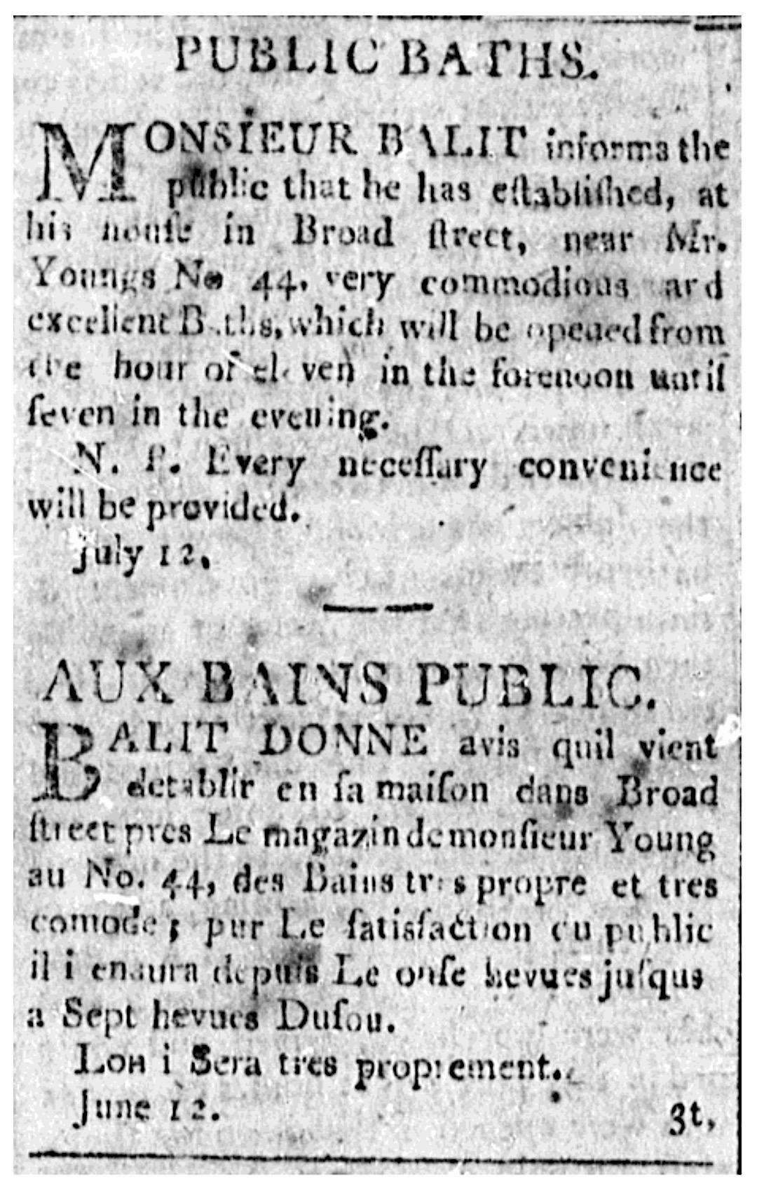 [10] South Carolina State Gazette, 14 July 1794, page 1, “Public Bath”; City Gazette, 9 April 1795, page 3, “The Citizen Cornet”