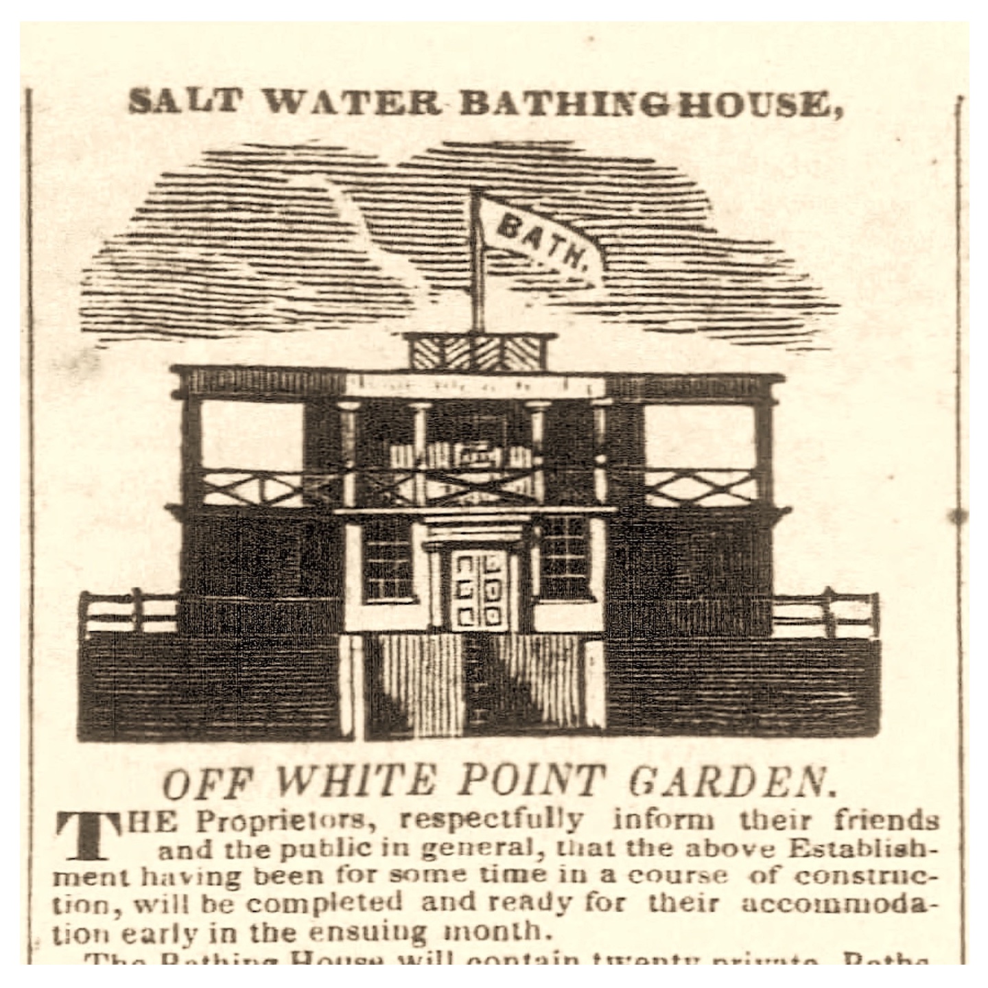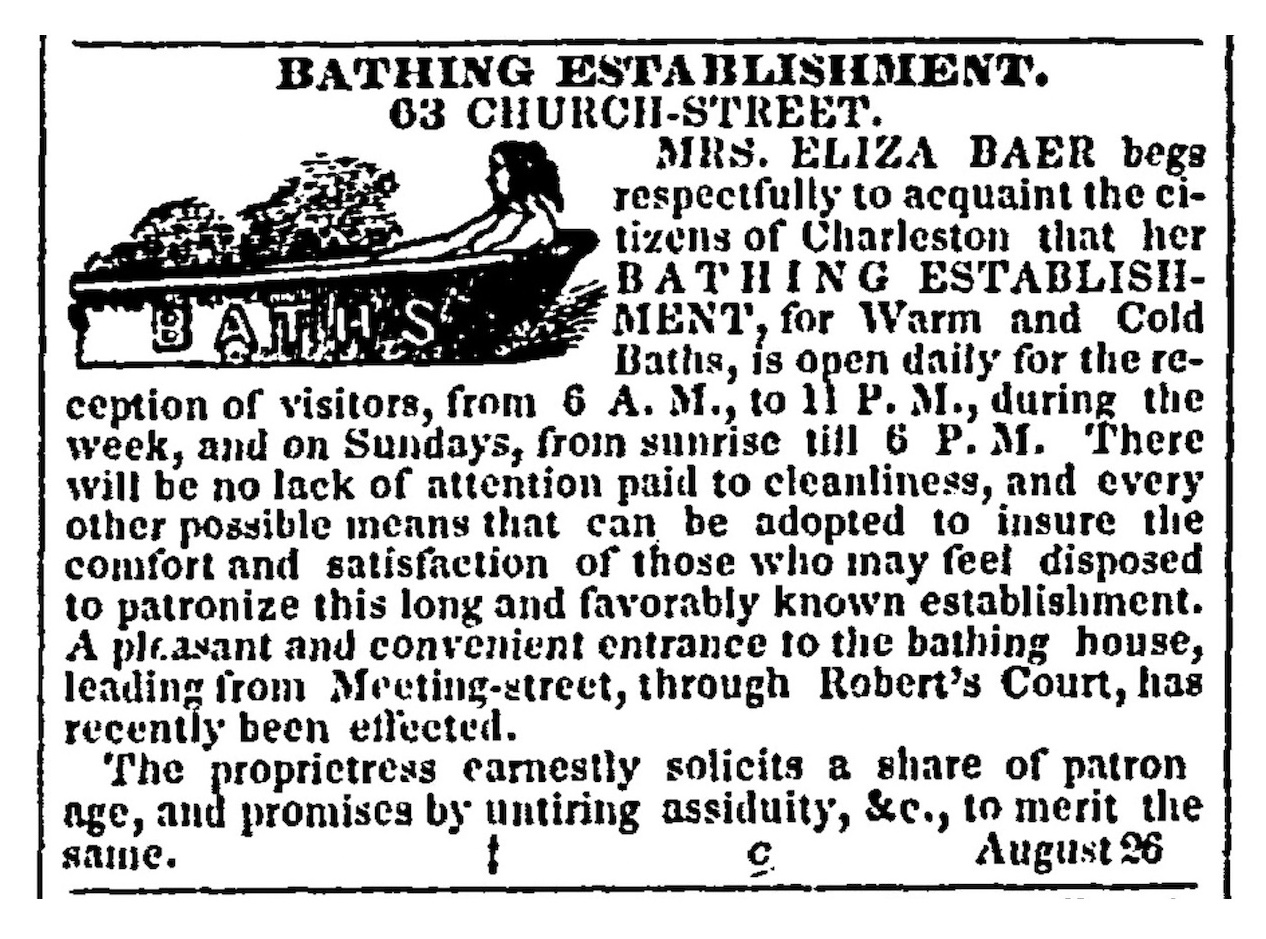 [12] City Gazette, 2 April 1810, page 3, “Publick [sic] Baths”; Courier, 25 April 1825, page 3, “Warm and Cold Baths”; Courier, 25 Mat 1827, page 3, “Bathing Establishment”; Courier, 27 April 1829, page 3, “Charleston Baths.”