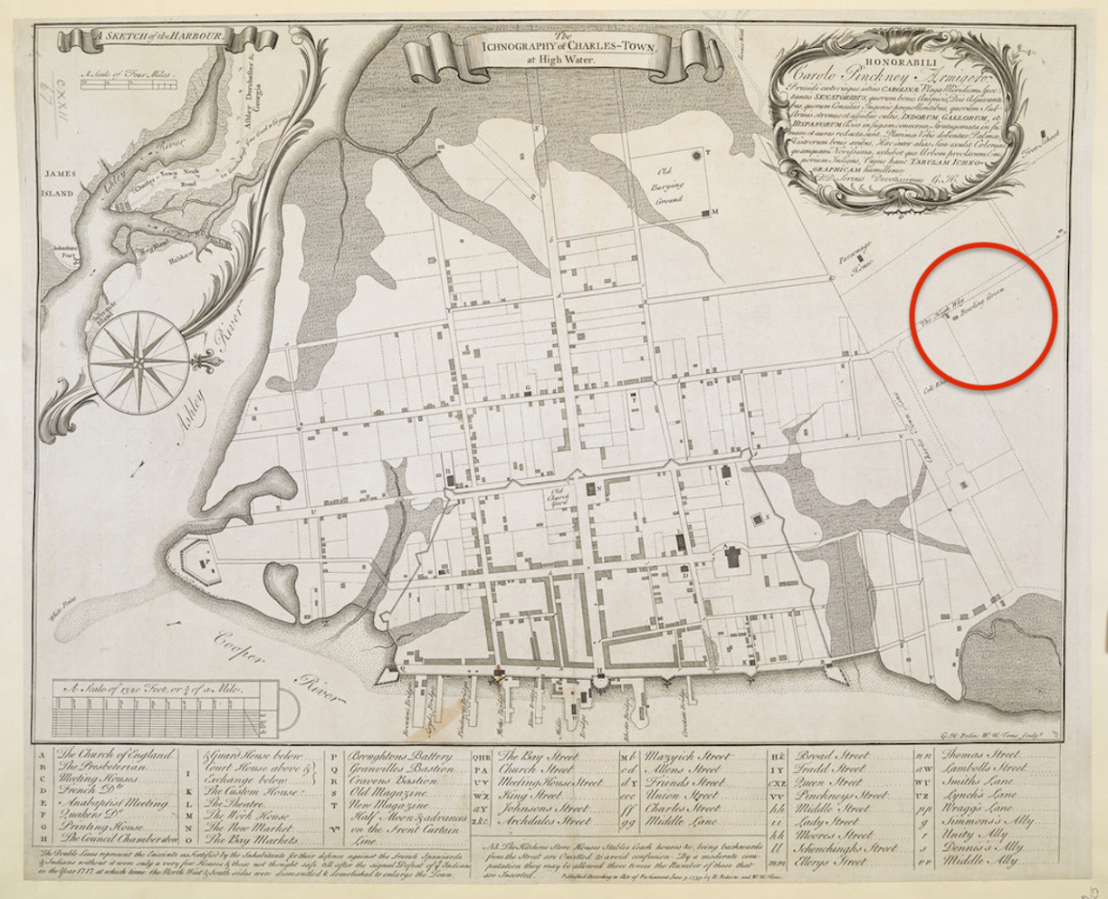 Around the turn of the eighteenth century, when Charleston was still a very young settlement, most of the inhabitants lived and worked near the Cooper River waterfront. We might imagine that they their children played and denizens occasionally congregated on the undeveloped green spaces on the western edge of the town plan. As the population increased and development spread across the lower peninsula, however, the people of Charleston seem to have looked northward for recreational green spaces. The surviving records from the first half of the eighteenth century provide very few clues about the geographic location or the nature of their recreational activities, but we know that they ran, played, congregated, mustered, paraded, and grazed at some place or places in proximity to the town. The earliest clues that I’ve found to this mystery point to a location familiar to almost anyone who’s ever visited Charleston—the historic heart of the town’s first suburb, Ansonborough.