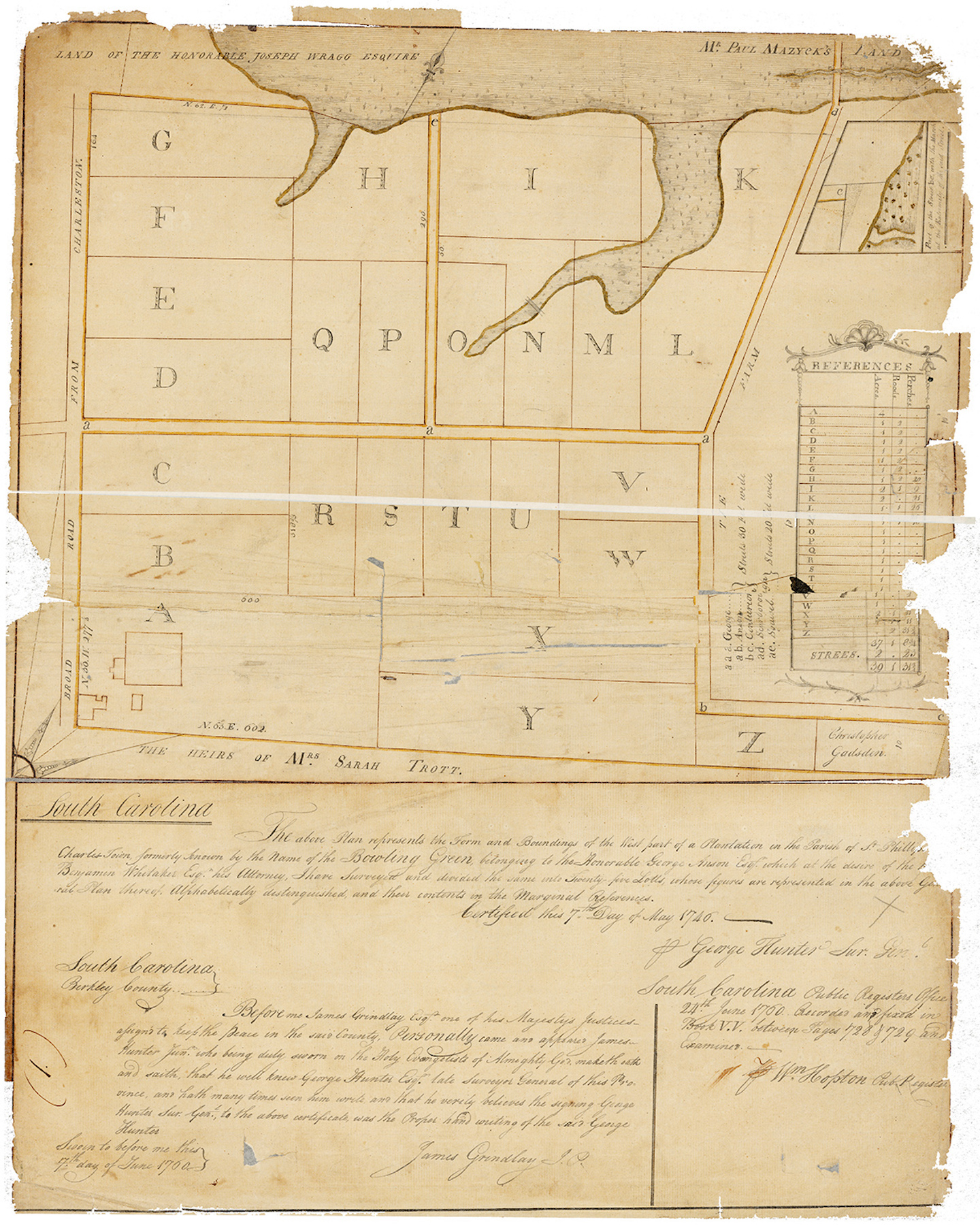 [1] Henry A. M. Smith, “Charleston and Charleston Neck: The Original Grantees and the Settlements along the Ashley and Cooper Rivers,” South Carolina Historical and Genealogical Magazine 19 (January 1918): 8–10; the reduction of Mazyck’s ninety-acre tract is mentioned in Sarah Rhett to Bently Cooke, enfeoffment, 16 February 1708/9, Charleston County Register of Deeds (hereafter RoD), book A: 188–96; and Isaac Mazyck to Bartholomew Gaillard, enfeoffment, 11 November 1717, RoD K: 434–36. Mazyck’s conveyance to Gadsden, dated 29 October 1720, was not recorded, but it was described in Thomas Gadsden to George Anson, lease and release, 23–24 March 1726/7, in RoD F: 89–99.