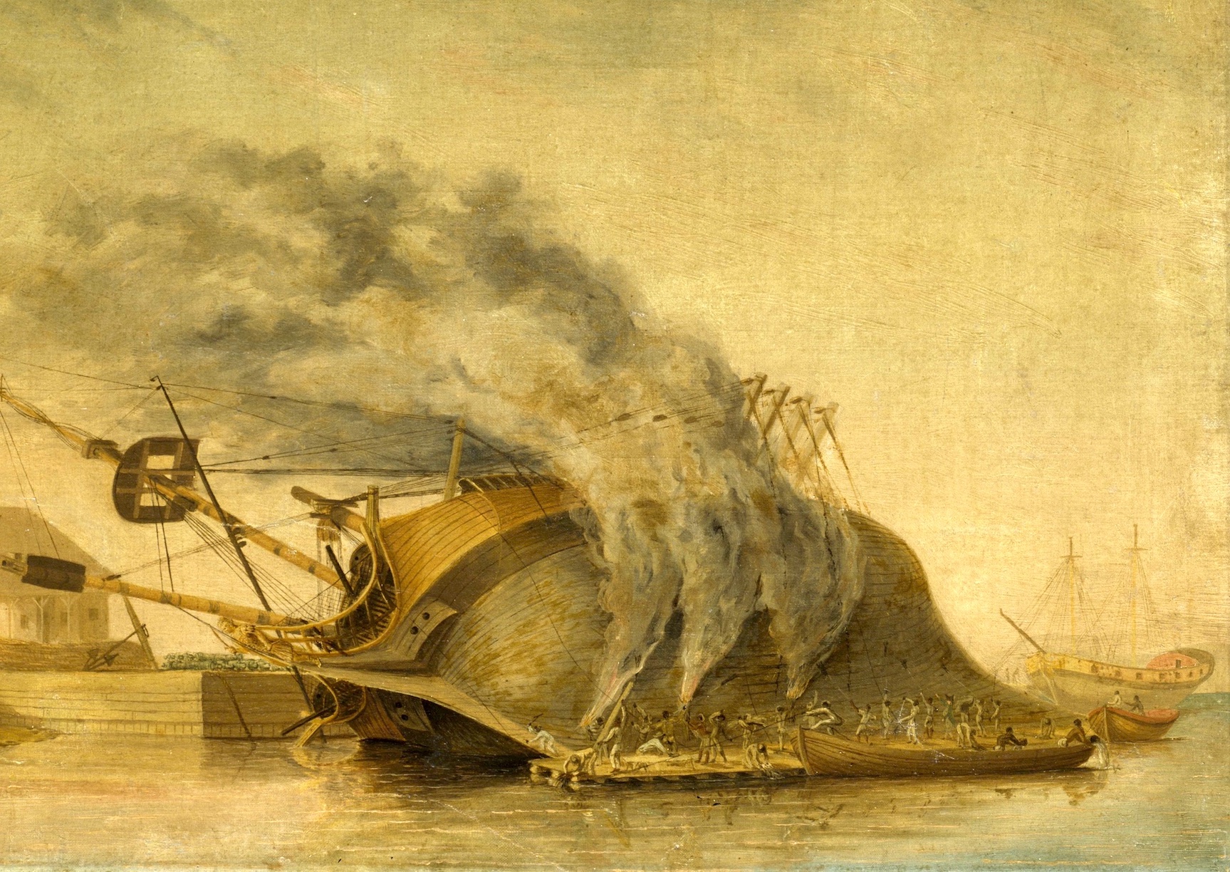 The unpleasant work of applying pitch and graving to the bottom of a wooden vessel was rendered even more disagreeable by several extenuating circumstances. First, any remnants of an older layer of graving had to be removed by a process called “breaming.” Workers gathered reeds and pine brush from local maritime forests to create torches that they held against the hull. While the flames burned the accumulated bio-growth and melted the old graving, workers used iron tools to scrape the residue from the wooden hull into the water below.[7] After the surface was thoroughly breamed, all of the ingredients for the fresh graving had to be heated before application. If thoughts of boiling animal fat and tar turn your stomach, consider one other common factor. Because the laborers stood on platforms floating off-shore, the graving materials were often heated in iron cauldrons standing on the same platforms. In short, the men performing the breaming and graving worked in a noxious atmosphere of acrid fumes and smoke, and occasionally suffered burns from the bubbling brew near their feet.[8]