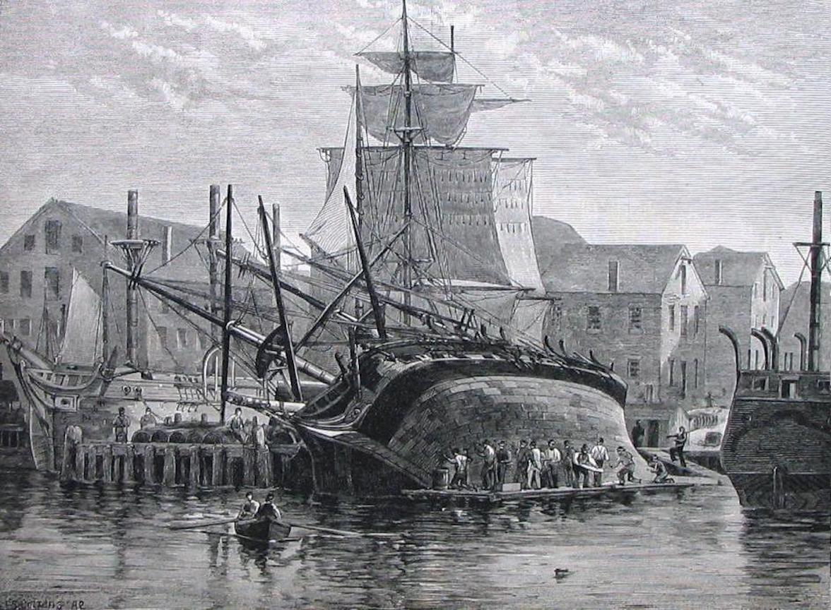In the earliest days of the Port of Charleston, small and medium-sized vessels often careened on the bank of a river or creek at low tide, or along the east side of the mudflat we now call East Bay Street (see Episode No. 180). The ubiquitous small schooners that ferried people and goods between the town and upriver plantations (and vice-versa) could careen within quiet, secluded creeks, or at one of the private plantation landings along the several rivers of the Lowcountry. As larger merchant vessels from the Caribbean and England began visiting Charleston around the turn of the eighteenth century, a few local property owners like William Rhett began building wooden wharves extending eastward from East Bay Street to the channel of the Cooper River. The number of wharves increased as the decades progressed, providing ample facilities for medium-sized vessels to careen, bream, and grave their hulls.