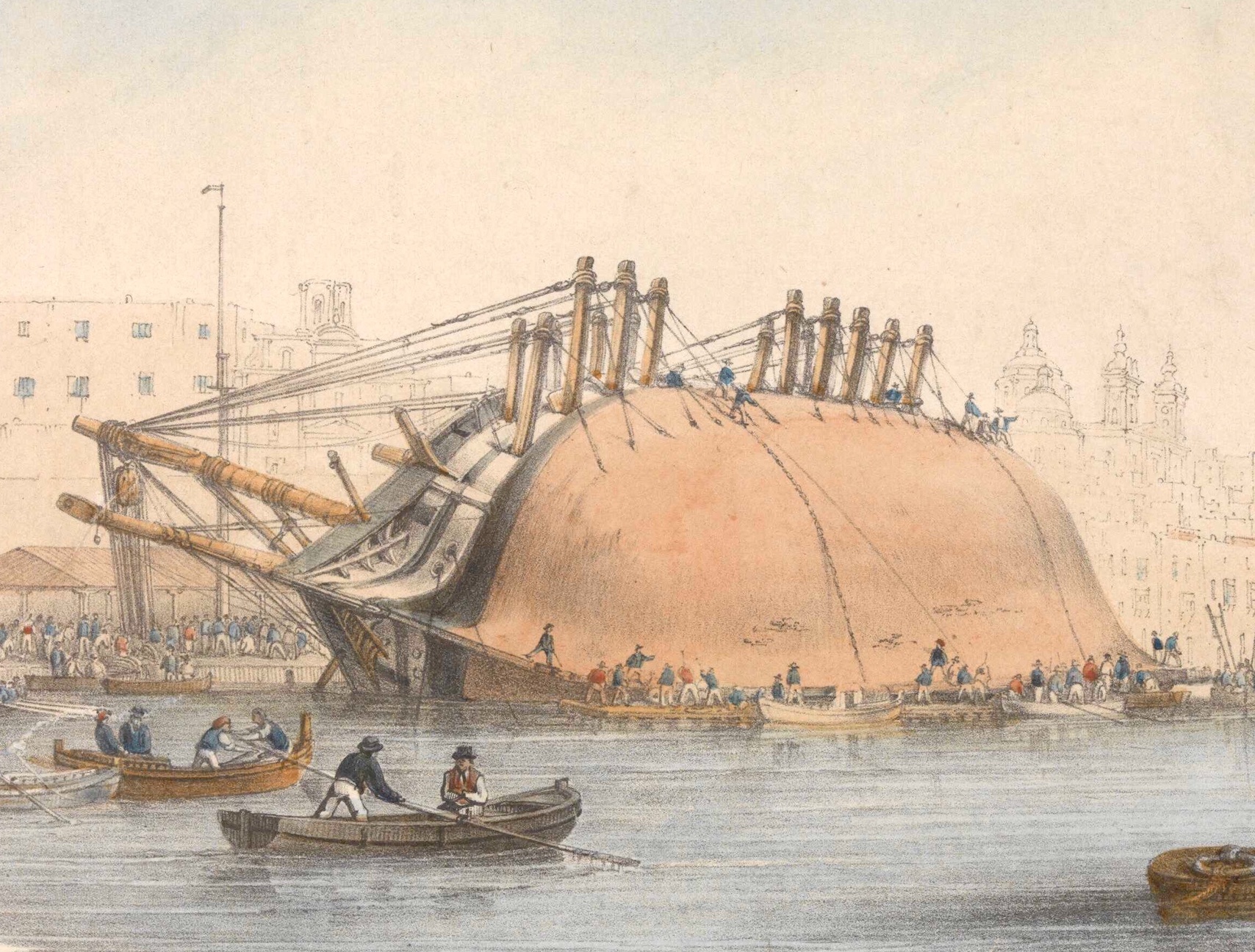 The crew then began to attach implements to facilitate the ship’s roll towards the wharf. To the top of the fore- and mainmast they attached a pair of careening blocks—large wooden cases with brass sheaves—that multiplied the mechanical force exerted on a line rove through them. To brace the two masts, the crew affixed to each a pair of timber shores that extended from the outboard edge of the deck to the middle of the mast. To help distribute the pulling force from the blocks to the hull, the crew installed several outrigger spars across the deck that projected through gun ports over the water side of the ship. Heavy ropes led from the outboard ends of the outriggers to ringbolts set into the hull, while similar rope shrouds led from the outriggers to the mastheads. The crew rove these lines through each of the blocks at the mastheads and led the loose end or “outfall” from each block down to another block attached to a well-braced point on the deck of the wharf or on the nearby shore.