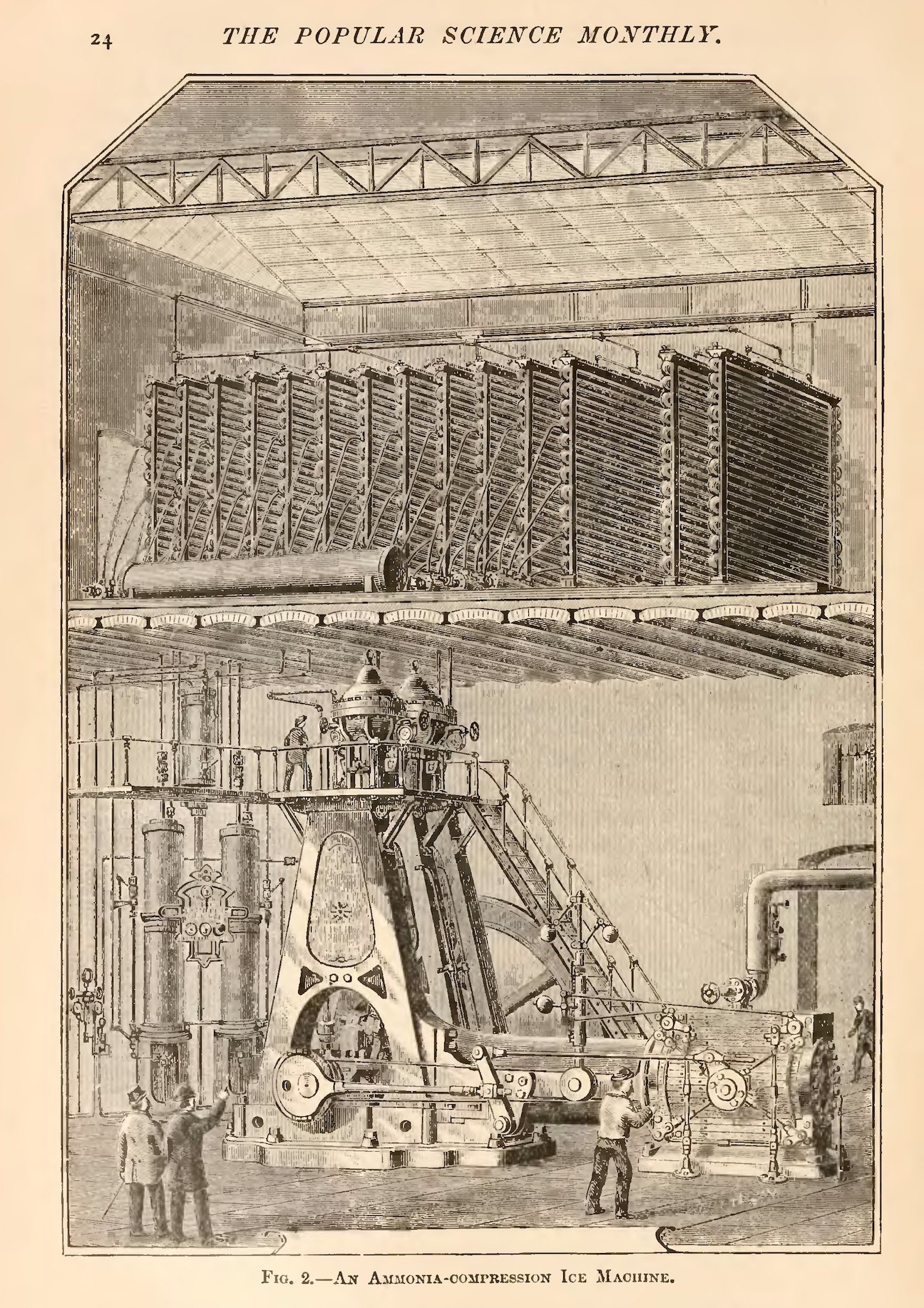Cans or buckets of fresh, filtered water are suspended in a bath of briny water. A steam-powered pump forces liquid ammonia from a high-pressure reservoir into a closed network of coiled pipes immersed in the same bath of briny water. As the liquid ammonia expands in the pipes, it changes into a gaseous state and draws heat energy from the adjacent brine. The brine chills rapidly and, in turn, draws heat energy from the fresh water within the cans. While the salt in the brine prevents it from freezing, the fresh water in the cans freezes into a solid block over a number of hours. The ice is then removed from the cans, which are refilled with fresh water. Meanwhile, the gaseous ammonia is pumped back to the reservoir, re-pressurized into a liquid state, and re-circulated through the system to repeat the chilling process. By automating the work of filling and emptying the cans, this production cycle can continue around the clock with minimal human effort.