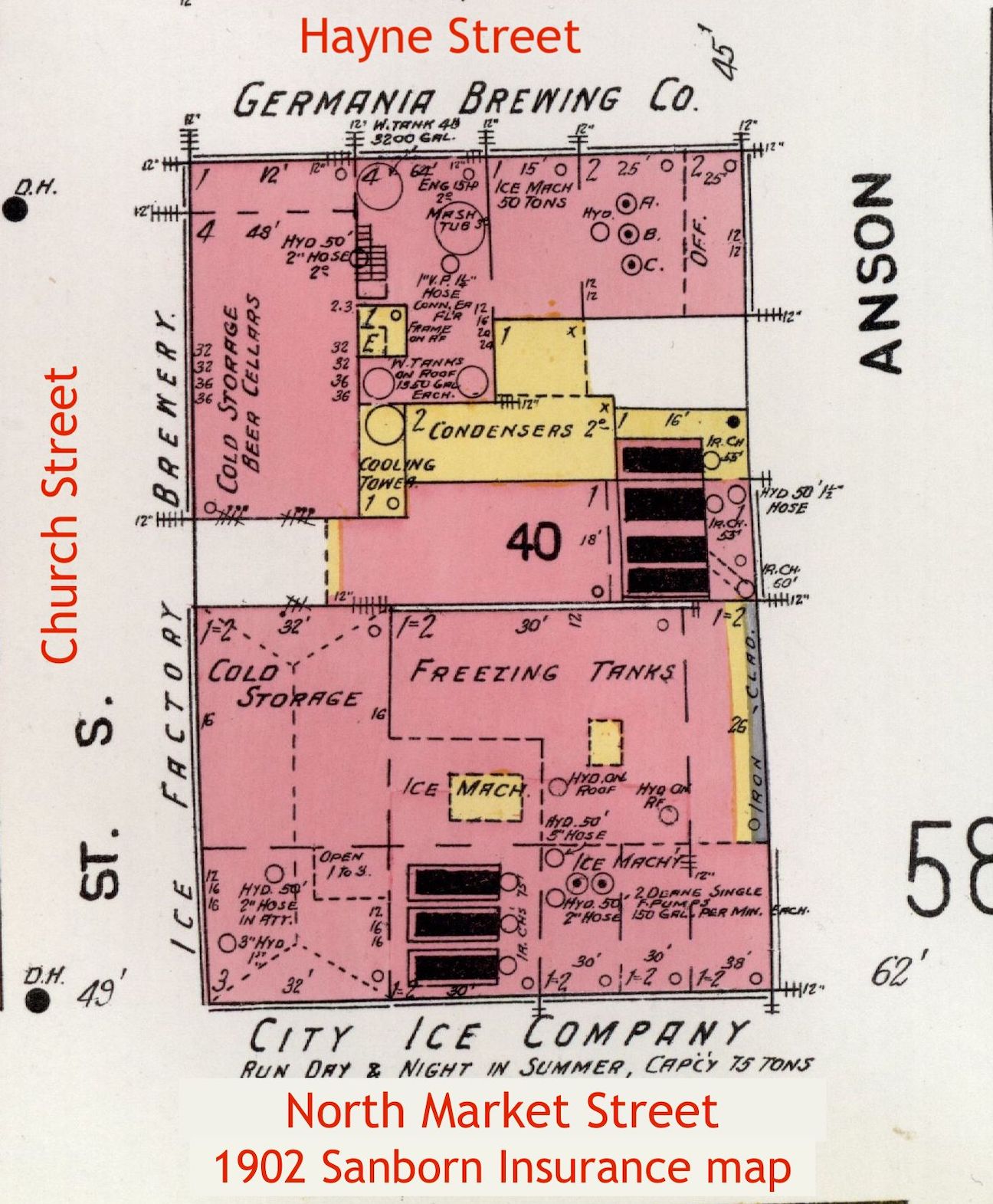 [18] Evening Post, 19 December 1916, page 4, “Big Ice Factory On Brewery Site”; Evening Post, 22 January 1917, page 50, “Carolina Public Service Company”; Evening Post, 3 July 1917, page 8, “Plant Nears Completion”; News and Courier, 15 August 1918, page 8, “Says Ice Famine Is Just About Over”; News and Courier, 29 June 1920, page 12, “Local Capitalists Control Ice Plant”; Evening Post, 27 April 1920, advertisement on page 9 of “Elks Booster Edition”: “Carolina Public Service Co.”; News and Courier, 20 May 1923, page C-14, “Entire Square For Ice Plant.” The resulting factory is depicted on page 57 of the Sanborn Fire Insurance Company map of Charleston, 1944 edition.