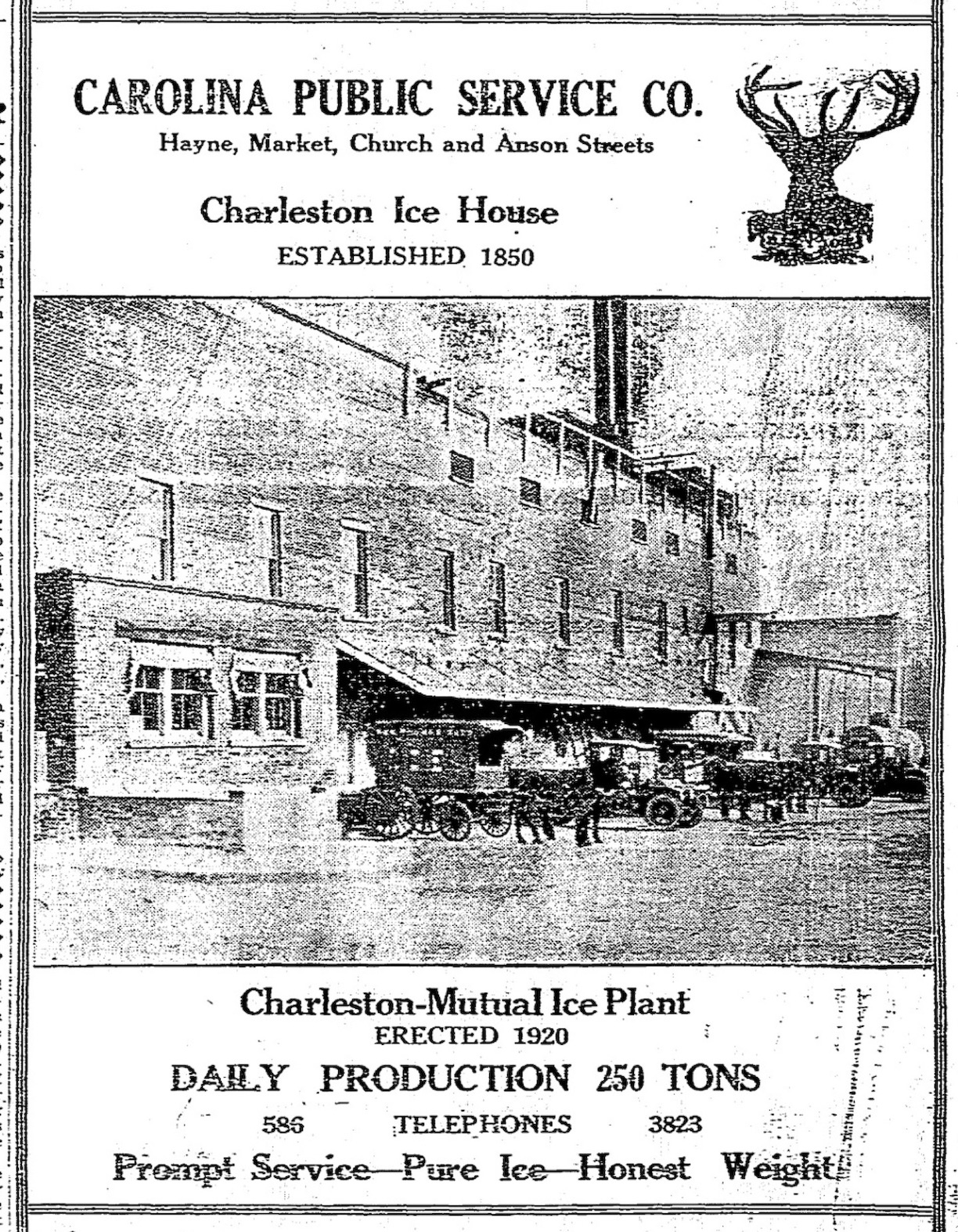 [20] News and Courier, 10 August 1918, page 6, “Brisk Demand For Ice Due to the Shortage”; News and Courier, 14 August 1918, page 8, “Public Is Urged To Buy Less Ice”; News and Courier, 15 August 1918, page 8, “Says Ice Famine Is Just About Over; Evening Post, 8 July 1920, page 10, “The Heavy Demand Makes Ice Short.”