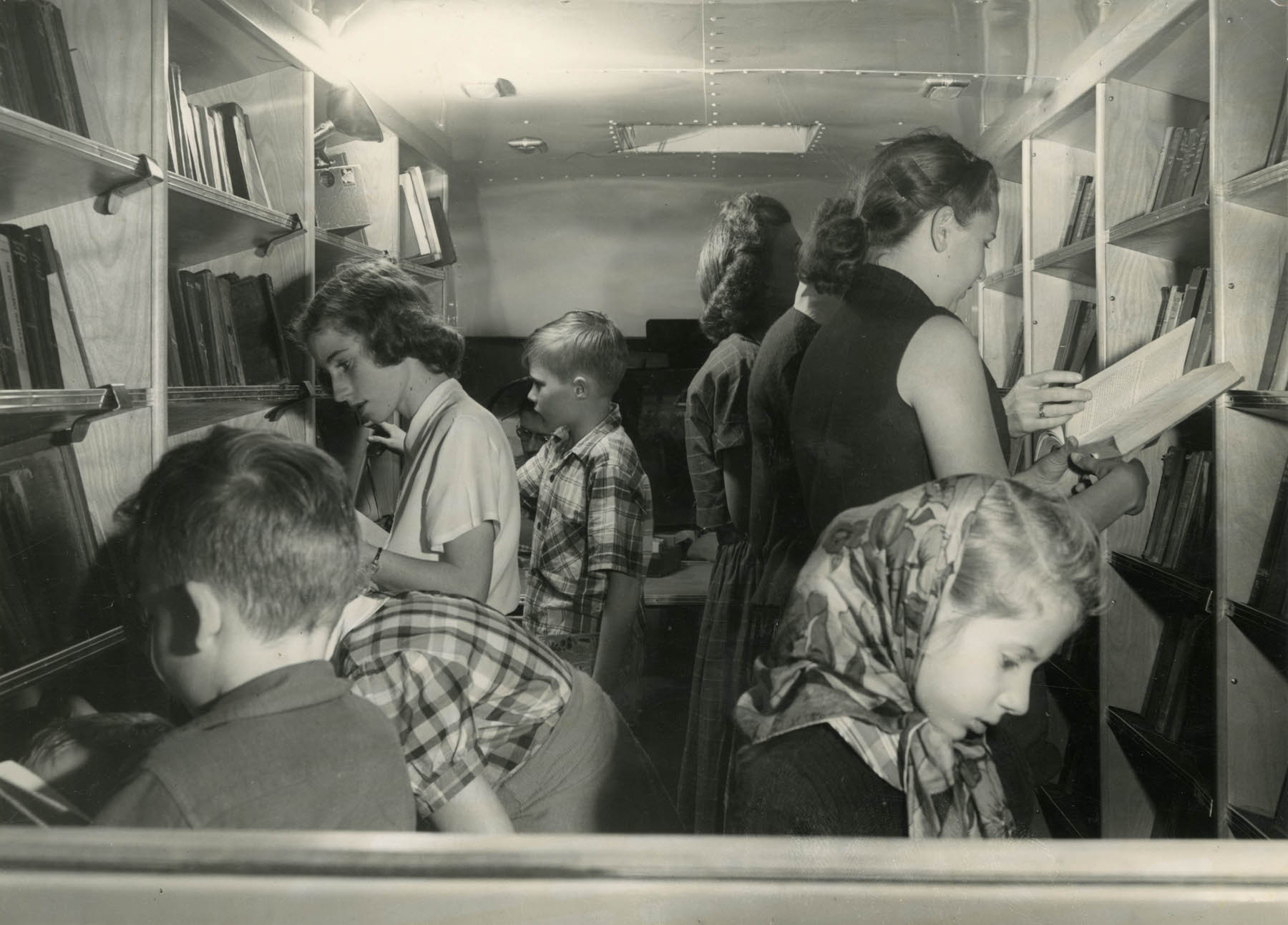 The library’s first five bookmobiles, regardless of the patrons they served, shared one problematic feature: their functionality was limited during periods of inclement weather. The arrangement of books on exterior shelves behind glass doors facilitated easy access to mobile patrons, but that attractive feature was less appealing during cold weather and rainstorms. Furthermore, the constant exposure to the elements shortened the lifespan of the books within the mobile collection. Even the sheltered bookshelves of the 1946 Chevy used for “Negro” service rendered it impossible for customers to browse at their leisure.