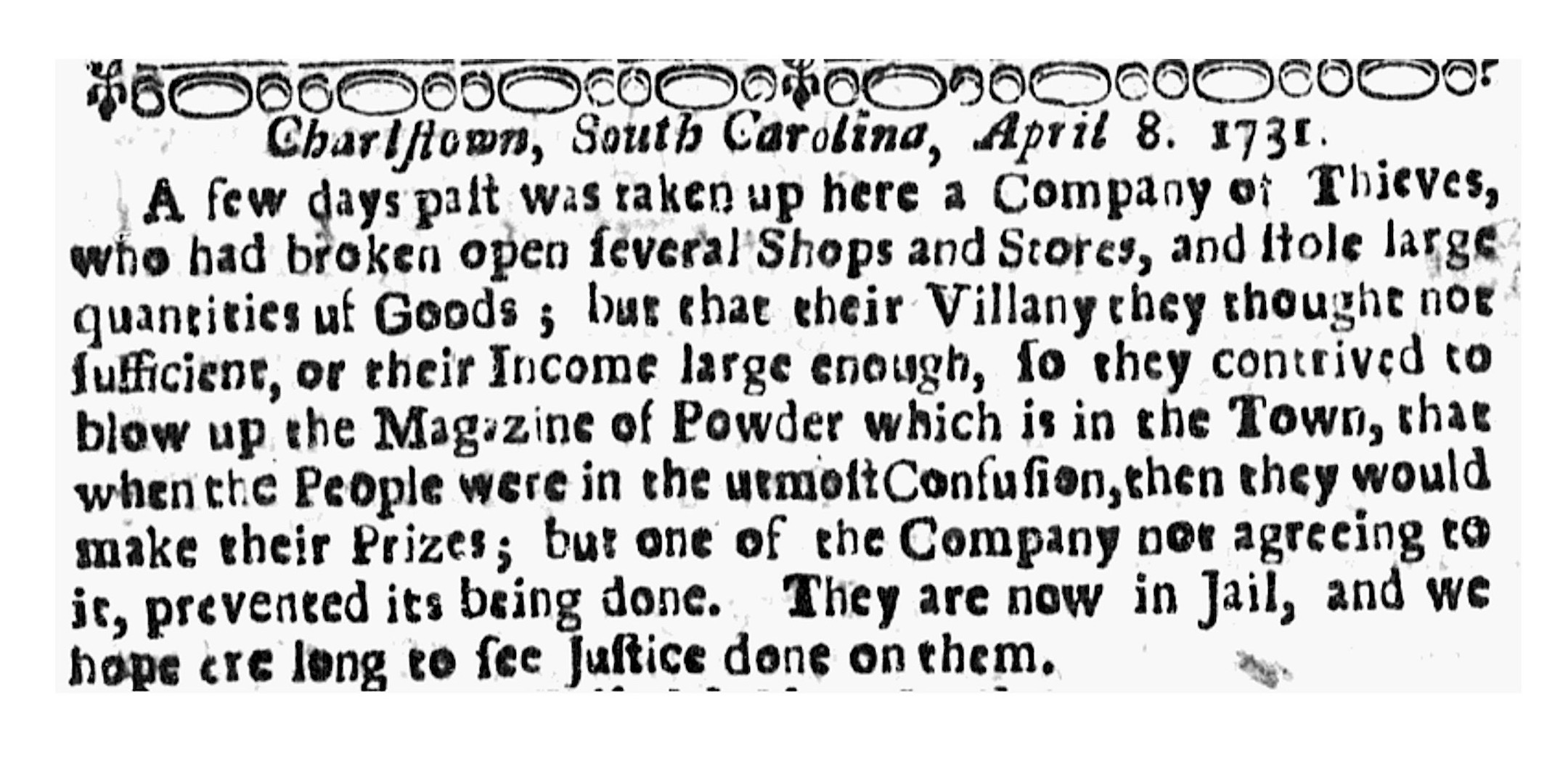 A newspaper published in Boston in the spring of 1731 included a short paragraph of text forwarded from “Charlestown, South Carolina,” dated April 8th, describing a shocking discovery: “A few days past was taken up here a company of thieves, who had broken open several shops and stores, and stole large quantities of goods; but that their villany [sic] they thought not sufficient, or their income large enough, so they contrived to blow up the magazine of powder which is in the town, that when the people were in the utmost confusion, then they would make their prizes.”[2]