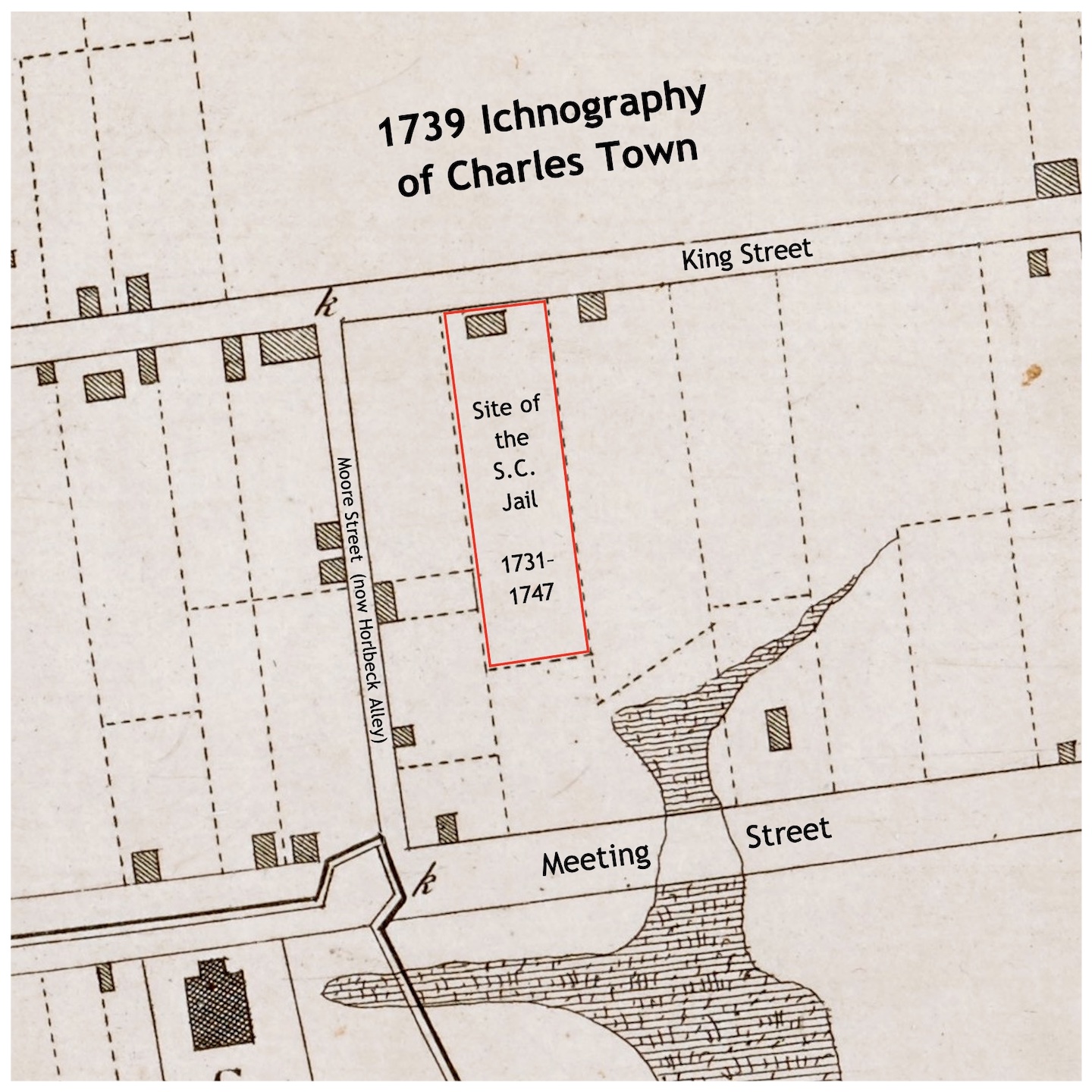 Regardless of who hatched the gruesome plan, we know that it did not meet universal approval. The first news report of the Charleston plot, published in Boston in April 1731, stated that “one of the company not agreeing to it, prevented its being done.”[10] That someone might have been gang member George Keith, who likely informed some local figure—perhaps Colonel Miles Brewton—and named names. Perhaps Brewton observed the suspects casing the joint, as they say in the movies, grabbed Keith, and squeezed a confession out of him. The alleged co-conspirators were probably arrested by members of the town’s paramilitary night watch, who delivered them to Provost Marshal William Bampfield for incarceration.[11] The marshal was South Carolina’s chief law-enforcement officer at the time and the proprietor of the colony’s sole jail. By the spring of 1731, the provincial prison was located within a moderately-secure rented house on the east side of King Street, approximately one hundred feet north of Moore Street (now called Horlbeck Alley).[12]