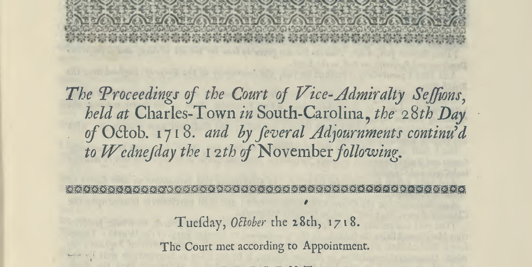 Over the course of five weeks in the autumn of 1718, the people of Charleston witnessed thirteen trials of fifty-eight men accused of piracy. Clerks wielding quill pens and ink made a paper record of this entire courtroom spectacle, most of which was published in 1719, but few people have seen the text of this dramatic narrative. Today I’ll offer a bit of context for this valuable historical record and provide a summary of the confusing sequence of trials. If you’re a fan of courtroom drama, this is a screenplay waiting to be written.
