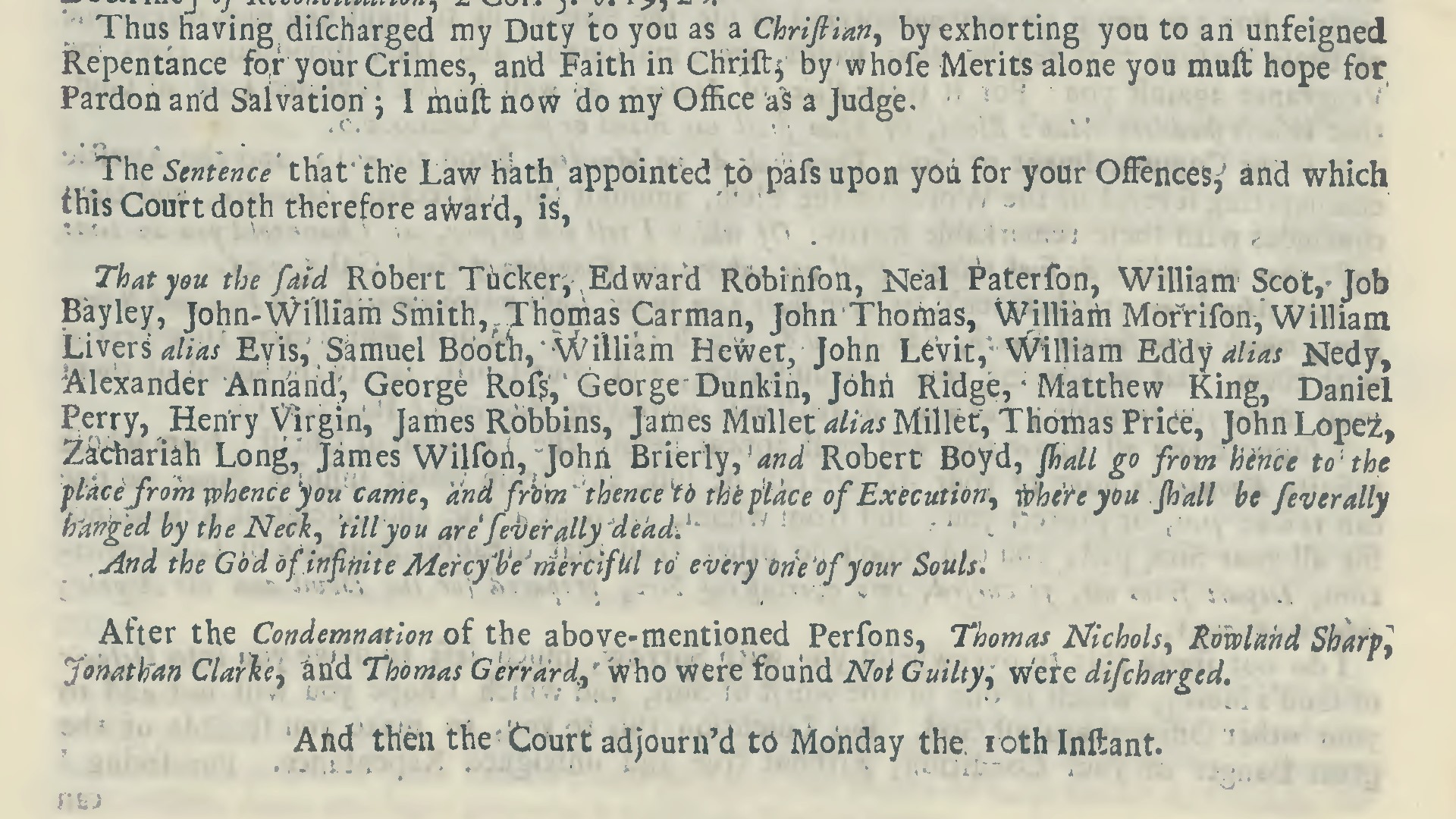 “The sentence that the law hath appointed to pass upon you for your offences, and which this court doth therefore award is, that you the said Robert Tucker, Edward Robinson, Neal Paterson, William Scot, Job Bayley, John-William Smith, Thomas Carman, John Thomas, William Morrison, William Livers alias Evis, Samuel Booth, William Hewet, John Levit, William Eddy alias Nedy, Alexander Annand, George Ross, George Dunkin, John Ridge, Matthew King, Daniel Perry, Henry Virgin, James Robbins, James Mullet alias Millet, Thomas Price, John Lopez, Zachariah Long, James Wilson, John Brierly, and Robert Boyd, shall go from hence to the place from whence you came, and from thence to the place of execution, where you shall be severally hanged by the neck, till you are severally dead. And the God of infinite mercy be merciful to every one of your souls.”