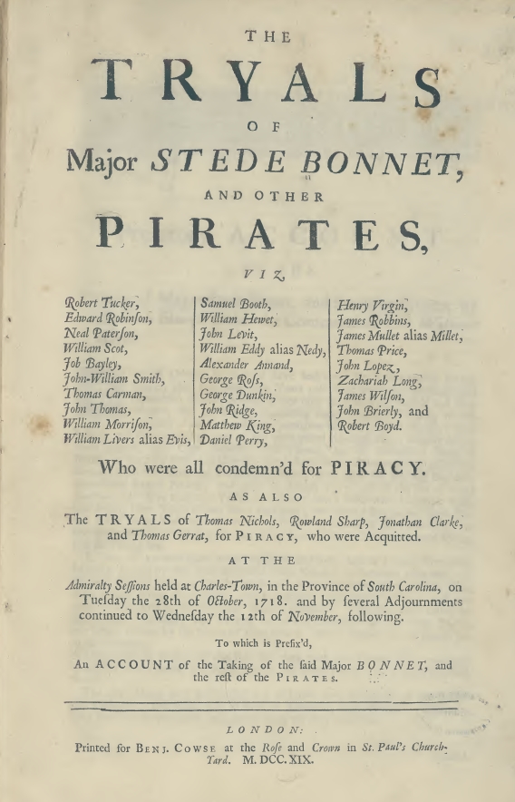 Despite all the shortcomings in the records of piratical activity in the early 1700s, we are fortunate that a robust written record survives from the Charleston pirate trials of 1718. In the wake of those important trials, some unknown person or persons carried or sent a copy of the complete transcript of the trials of Stede Bonnet and his pirate crew, taken directly from the manuscript proceedings of the South Carolina Court of Vice Admiralty.[1] Published in London in 1719 under the title The Tryals of Major Stede Bonnet, and Other Pirates, the court transcript was augmented by the addition of a preface concerning the capture of Bonnet and his pirate sloop, Revenge, and an appendix containing several witness statements used by the prosecution during the trials. This small publication, containing just over fifty pages of dense but very legible text, was probably printed in a rather limited numbers, and today it’s exceedingly rare. Nineteenth-century compilers of interesting British state trials thought fit to include the text of Bonnet’s trials in their voluminous publications, but general knowledge of these resources was limited until the digital age of recent years.[2] A few years ago, the Library of Congress digitized their copy of The Tryals of Major Stede Bonnet and made it available online. Today you can read the text on their website, or you can download the complete publication as a PDF.