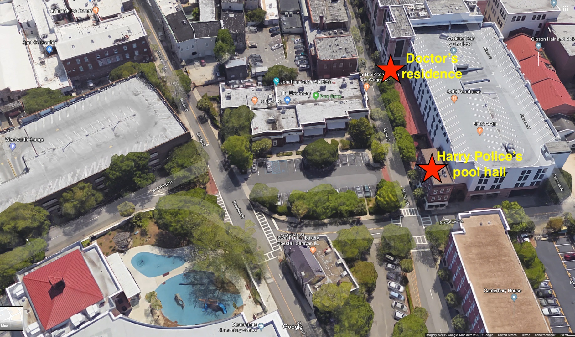 Meanwhile, rumors were spreading through the neighborhood that a black man had shot a sailor. This news incited a wave of anger that inspired a rush of people away from the bustling nightlife along King and Market Streets towards the scene of the alleged incident. About 9:30 p.m., Harry Police, the Turkish-immigrant proprietor of a billiards hall at the southeast corner of Market and Charles (Archdale) Streets reported that “several sailors came into this pool room and grabbed cues and billiard balls and ran out into the street.” After witnessing this act of theft, the black patrons already in pool hall “armed themselves in the same way” and ran out to join the raucous crowd in the street. In his later testimony, thirty-year-old Harry Police contradicted earlier reports that the riot had begun in his pool room. He steadfastly insisted there had been no fighting in his establishment, which he said closed as soon as the men departed with all his pool cues and billiard balls.[8]