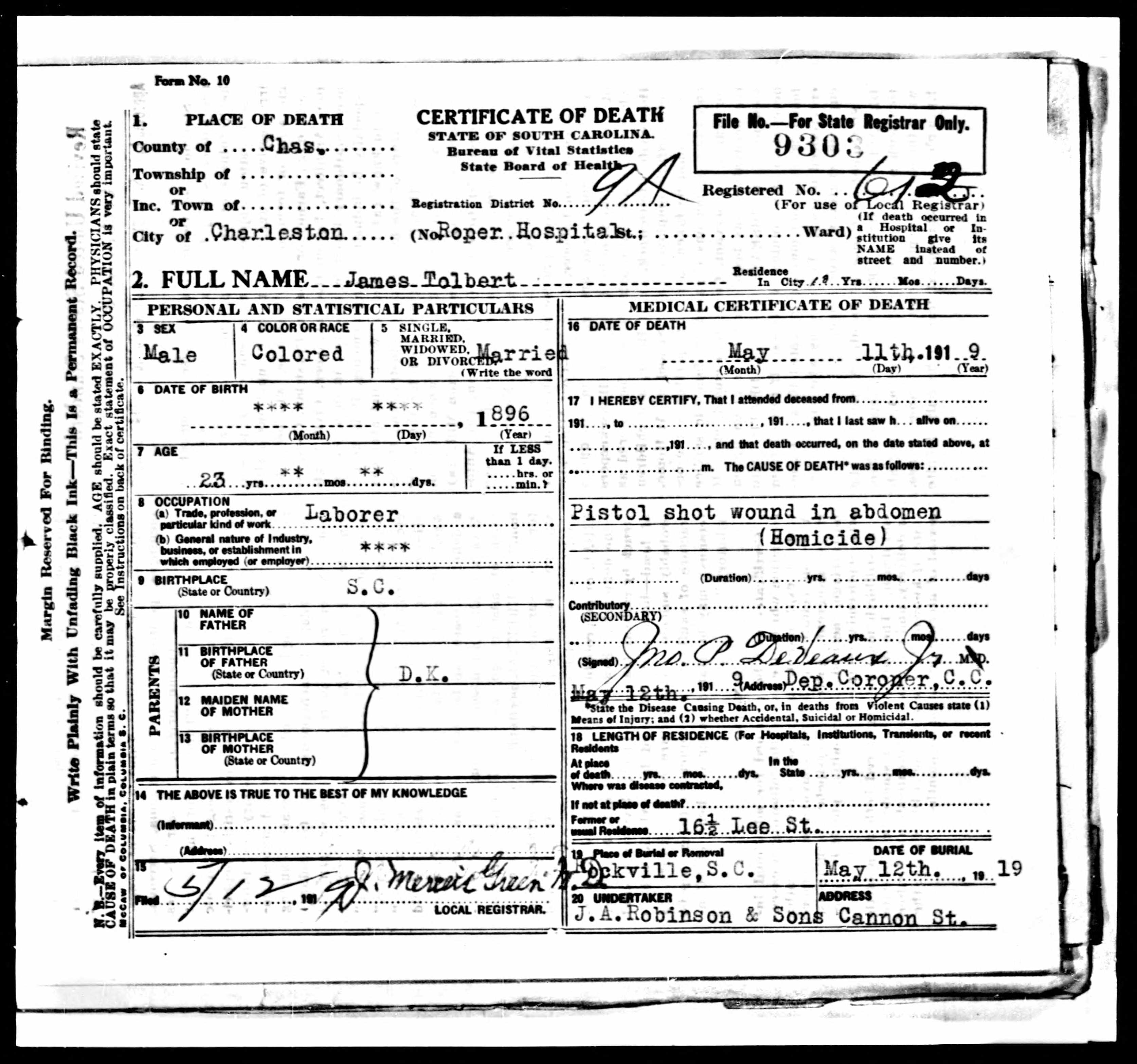 [23] These details were gleaned from the City of Charleston’s Return of Deaths and microfilm copies of Charleston County Death Certificates, both resources held at CCPL. The name of James Tolbert’s wife appears next to his name in Walsh’s 1919 Directory, page 732.