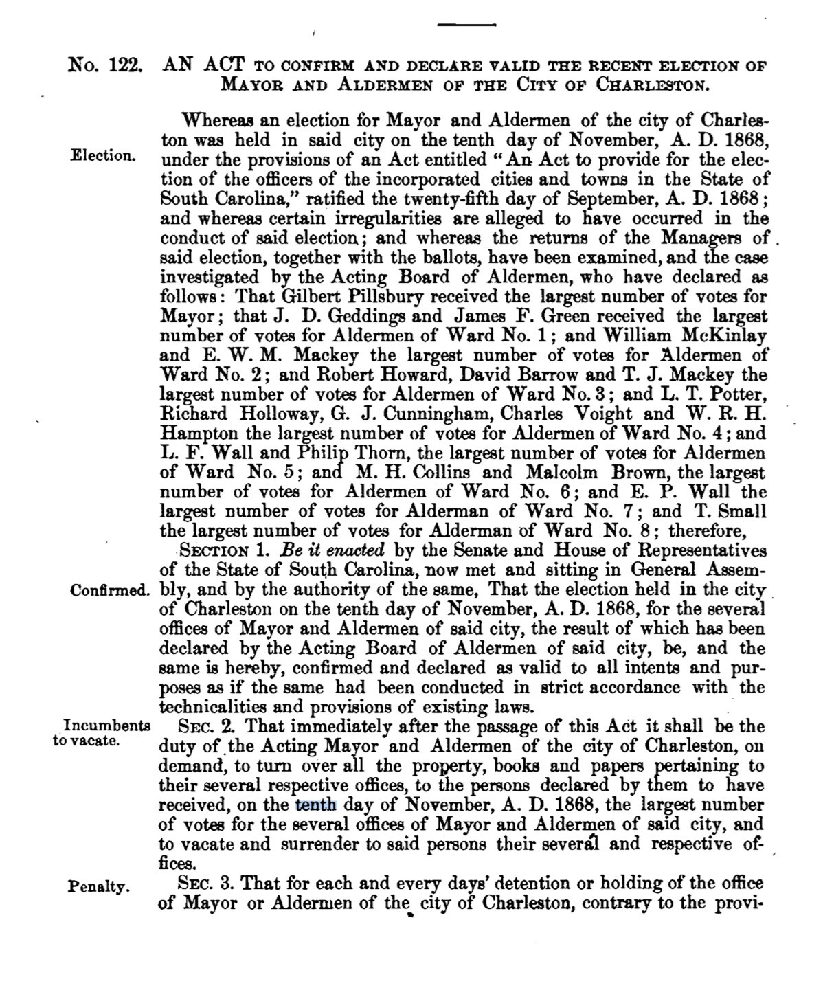 Having cleared that hurdle, South Carolina was now empowered to authorize the various municipalities within the state to hold elections. On September 25th, 1868, the state legislature ratified an act calling for municipal elections across the state on the second Tuesday in November. The persons elected on that day were to be sworn into office on the following Monday. In case of any “contested cases,” or in case any managers might be charged “illegal conduct,” the legislature empowered “the acting board of alderman” in the respective municipalities to investigate, arbitrate, and “declare the election, and their decision shall be binding upon all parties.”[3]