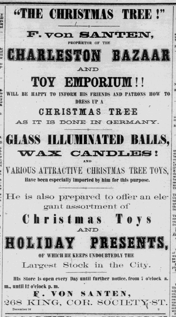 In fact, we can trace the beginning of the Christmas tree tradition in Charleston, with a fair amount of certainty, to a specific incident that took place in December of 1850. The story revolves around a mega-celebrity of that day, Swedish soprano Jenny Lind, who in September 1850 embarked on a long tour across the United States organized by master showman P. T. Barnum. After appearing to sold-out audiences in New York City, Ms. Lind and her fashionable entourage traveled in a private rail car across the northeastern states and performed in a number of cities. In mid-December, she sailed by steamship from Baltimore to Charleston, where our local newspapers had covered her travels with close attention. The sea voyage was stormy and unusually long, so Ms. Lind arrived in Charleston on December 23rd feeling seasick and exhausted. The first of her three concerts in the Palmetto City wasn’t until December 26th, but throngs of fans and admirers gathered outside her room at the Charleston Hotel on Meeting Street in the hopes of catching a glimpse of the celebrated “Swedish Nightingale.” On Christmas Eve, 1850, the people passing along the street noticed an unusual sight in the window of Jenny Lind’s room. “A Forest Tree,” observed the Charleston Courier, “was placed at her window, decorated with variegated lamps, which attracted much attention.”[6]
