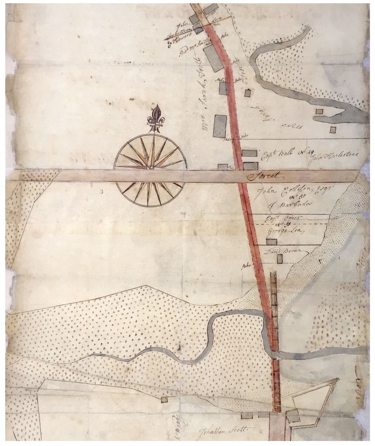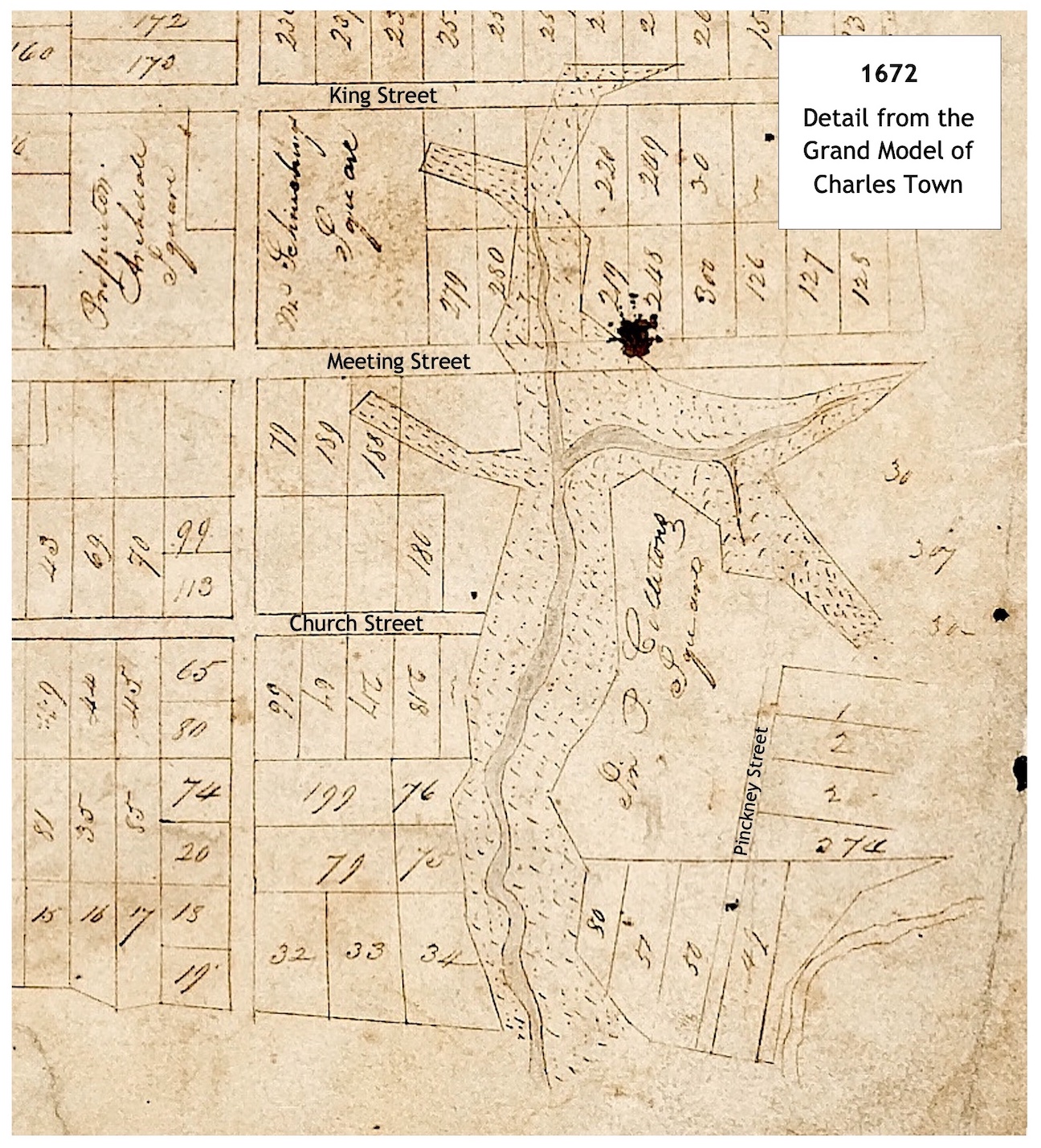 According to instructions, the resident chief surveyor delineated an irregular tract containing nine acres, two roods, and twenty-one perches of land near the northeastern boundary of Charles Town, immediately south of an unnamed street that later became known as Pinckney Street and east of the street now called Meeting Street. This vacant parcel, identified as Lot No. 80 in the Grand Model, included both highland and marshland abutting a serpentine creek flowing into the tidal waters of the Cooper River. To the immediate northeast of the creek’s mouth, the surveyor created two smaller waterfront lots numbered 50 and 51, each containing approximately half an acre (like most of the other lots in the nascent town). The proprietors’ deputies in Carolina then issued grants for this land on 5 March 1680/1 (on the Julian Calendar), assigning the larger Lot No. 80 to Sir Peter Colleton (1635–1694), one of the original Lords Proprietors of Carolina, and lots 50 and 51 to his younger brothers, James and Thomas Colleton.[2]