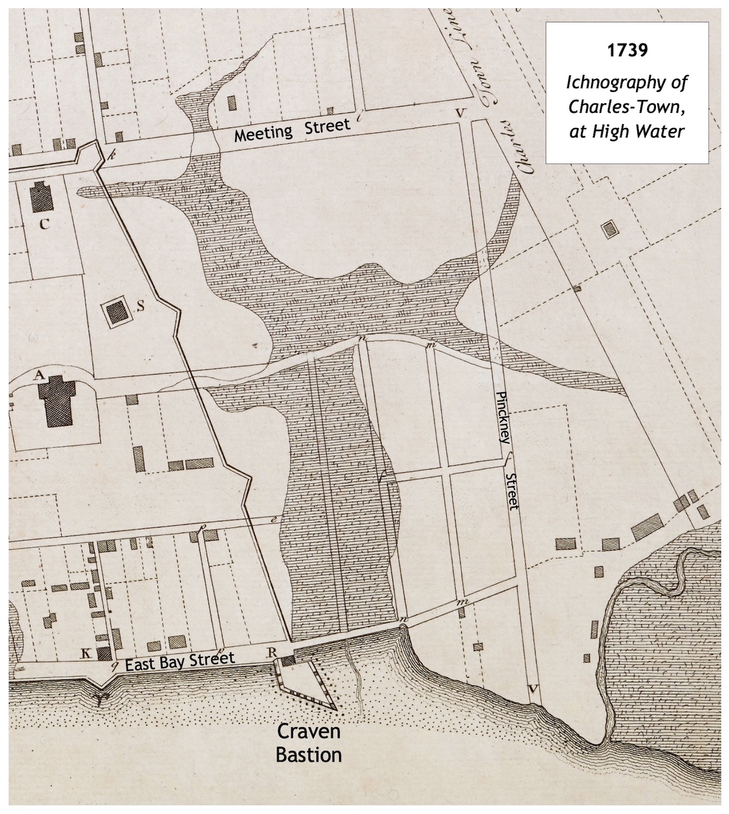 Another useful illustration published in the summer of 1739, known as the Exact Prospect of Charles Town, includes a small glimpse of Colleton Square at the extreme right-hand edge of the image. Just behind and to the right of Craven Bastion, one can see part of a bridge supported by wooden posts, evidently extending northwardly over the channel of Daniel’s Creek. As many frustrated pedestrians and drivers well know, the site of that early bridge is now under the constricted intersection of East Bay and Market Streets.