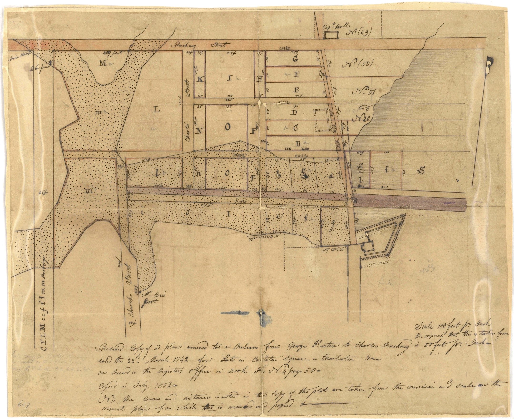 [7] An 1802 copy of Hunter’s 1743 plat is annexed to his formal deed of conveyance to Pinckney; see George Hunter to Charles Pinckney, lease and release, 21–22 March 1742/3 (sixteenth regnal year of King George II), CCRD, volume K4: 57–63, which was recorded in 1774; see also CCRD, McCrady Plat Collection, plat No. 619.