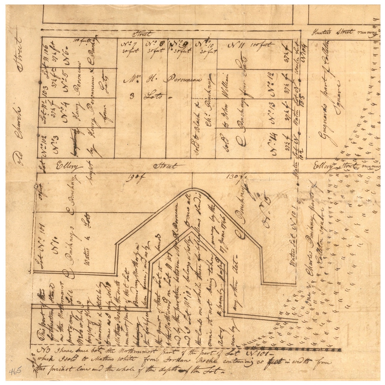 A more robust depiction of Colleton Square survives from the spring of 1743, when George Hunter drew a plat illustrating the initial subdivision of the property he shared with Charles Pinckney and Ann Ellery—widow of Thomas, who died in 1739. The remaining partners divided the nine-plus acres into approximately three dozen lots of various shapes and sizes arranged in three categories—high land fronting the aforementioned streets, marsh land in the creek bed, and water lots fronting the Cooper River. Each investor received a roughly-equal mix of three lot types in his/her respective share.[7]