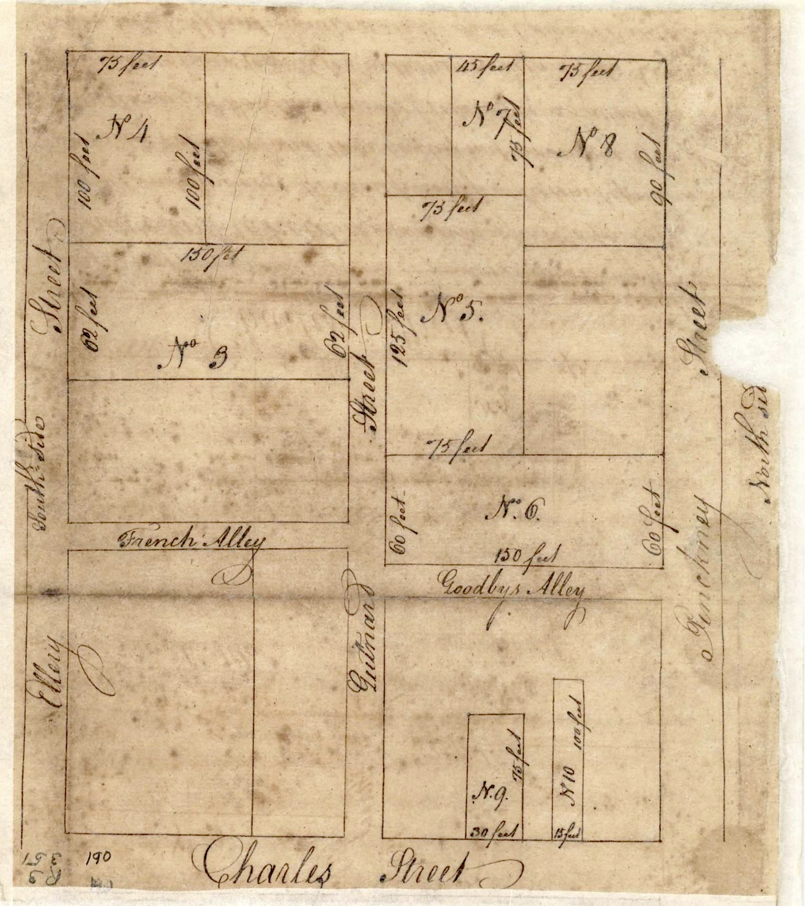 One of Charles Pinckney’s first sales in Colleton Square, executed in August 1744, was to a Huguenot cooper named Gabriel Guignard. To the French tradesman who owned a number of enslaved barrel-makers, Pinckney sold three contiguous lots forming the northwest corner of Grand Model Lot No. 80. The property in question abutted Pinckney Street to the north, Charles (now Anson) Street to the east, Ellery Street to the south, and extended westward to a boundary later defined by Maiden Lane. Monsieur Guignard thereafter extended Hunter Street (20 feet wide) through the center of this rectangular parcel, but called the extension Guignard Street. To provide additional access through the site from the south to north, he opened French Alley, twelve feet wide, approximately where Church Street might have run if it continued northwardly across Daniel’s Creek. The Frenchman immediately thereafter subdivided his two-and-a-half acre rectangle, which was occasionally called Guignard Square, and sold a number of smaller lots to tradesmen and investors like himself.[11]