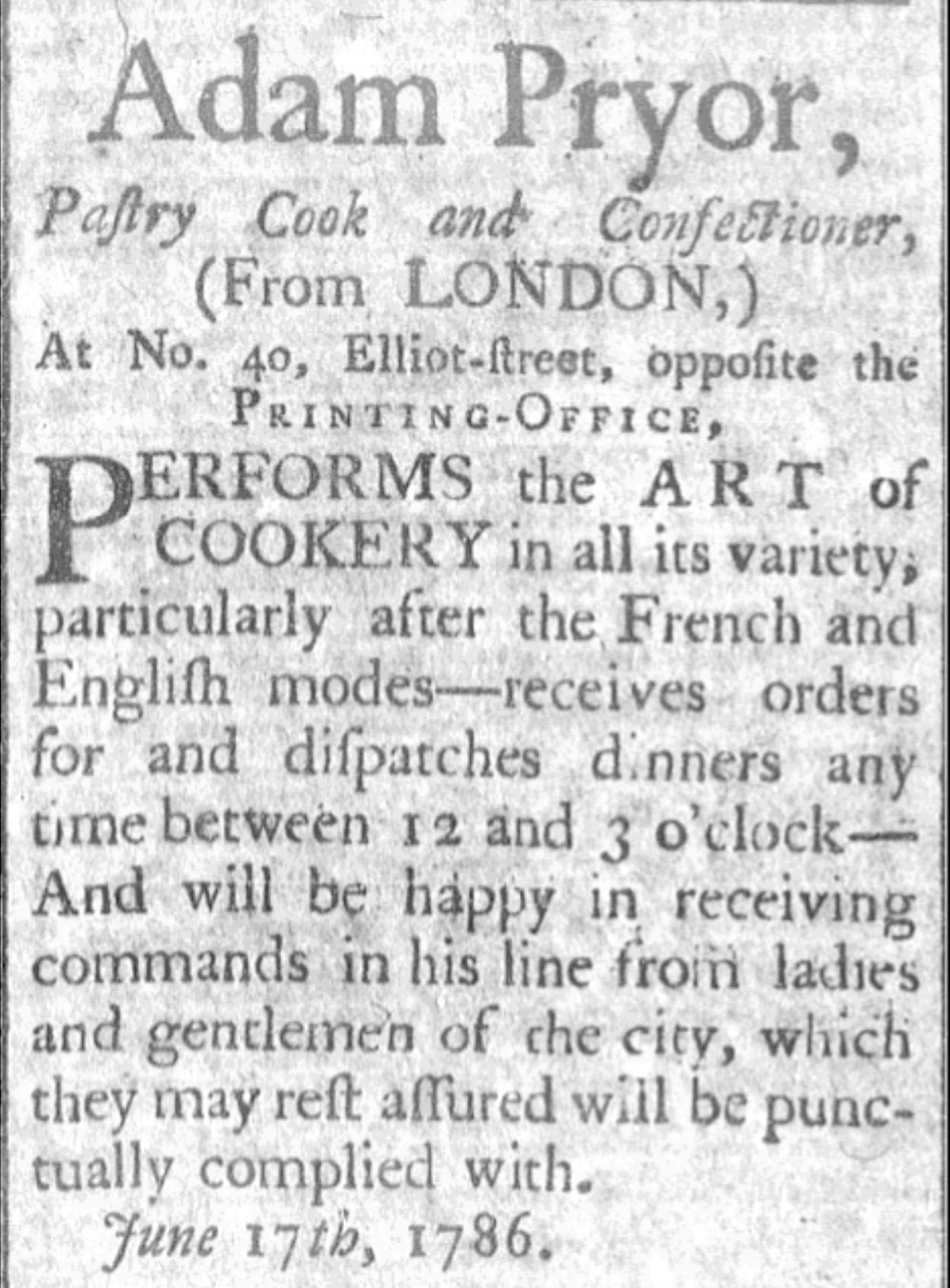 In the deep history of urban Charleston, just as today, there were lots of dining options available to residents and visitors, but our ability to study those past options is constrained by the paucity of written documents. All of our forebearers here in Charleston ate meals every day, of course, but eating is generally such a mundane activity that most people don’t write descriptions of their dining habits. Descriptions of cooking and ingredients and recipes are interesting branches of this topic, but I’m narrowing my focus to documentary evidence of the commerce of serving food and drink to paying customers. Some of the best information we have about the food and beverage industry in early Charleston appears in the local newspapers that commenced in Charleston in 1732. Here we find advertisements for services, descriptions of feasts given on special occasions, and small anecdotes about eating and drinking within essays about a wide variety of local news topics. But the newspapers were created for and read by a relatively narrow sphere of affluent, literate people. Those parts of the food and beverage industry intended for less-affluent people were not necessarily described in the newspapers. Consequently, we have very little evidence about the early food commerce related to folks at the lower end of the socio-economic scale. Like today, we might assume that poor people did not “dine out” very frequently, but sometimes there was no choice. People laboring outside their respective residences did not necessarily have the luxury of time to return home in the middle of the workday to prepare or eat a meal.