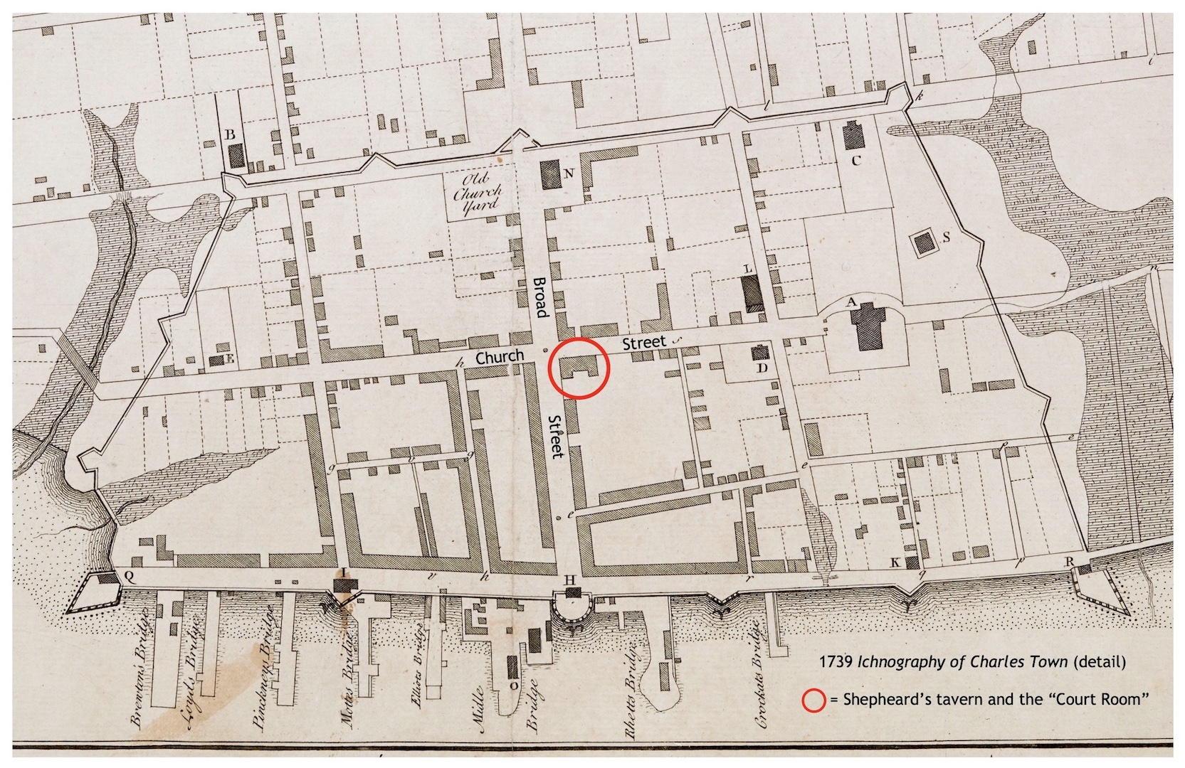 South Carolina’s first purpose-built courthouse opened in the late 1750s, within the colony’s first proper state house at the northwest corner of Broad and Meeting Streets. Prior to that time, the provincial government convened its courts of civil and criminal law within various commercial venues rented from private parties. Periodic court proceedings took place in the corner tavern in question as early as 1721, and continued therein (with a few interruptions) for more than thirty years. Throughout Charles Shepheard’s twelve-year tenure as the proprietor of the corner tavern, he received annual compensation of £100 currency (approximately £14.5.0 sterling) from the South Carolina General Assembly for periodic use of the multipurpose courtroom.[7]