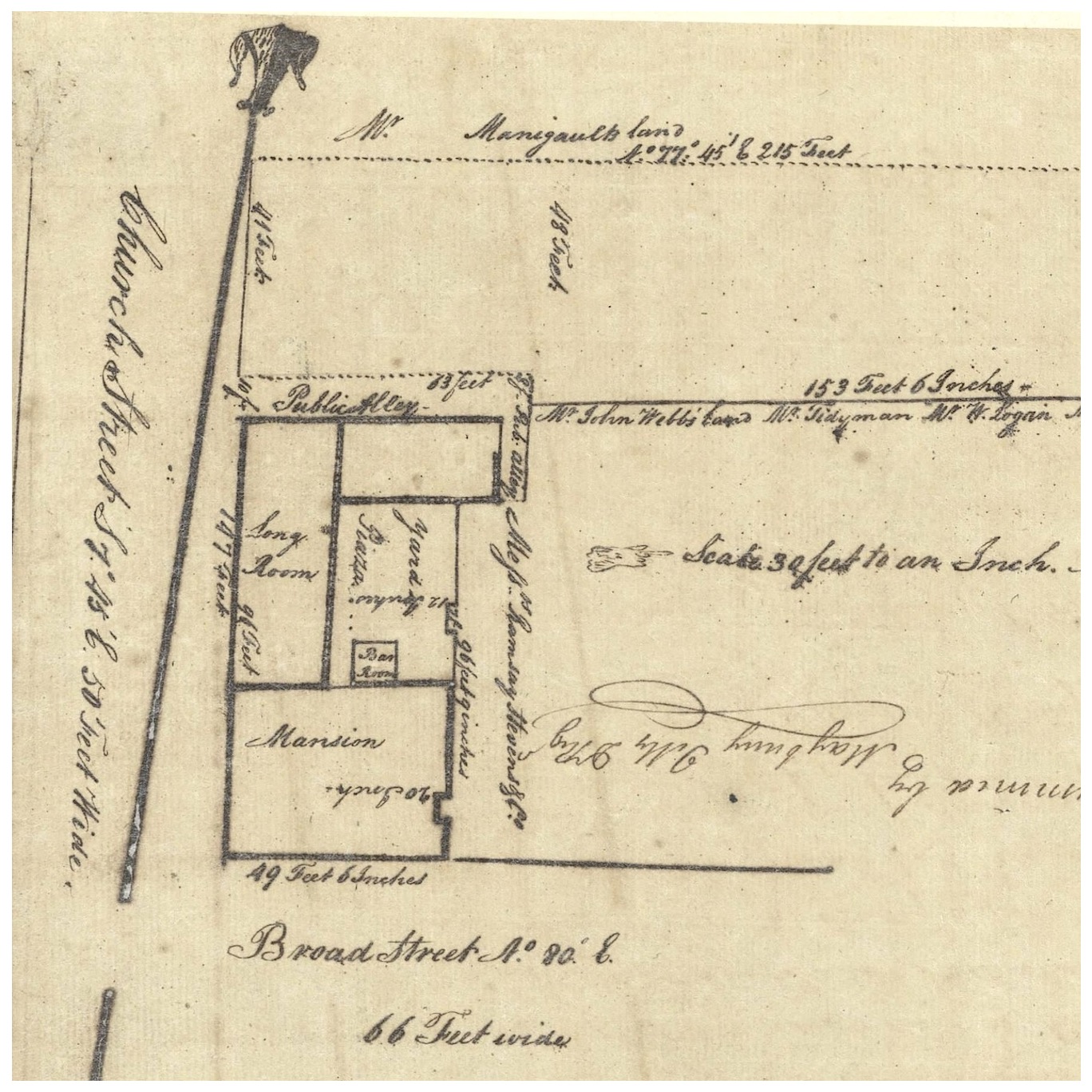 A 1787 plat of the old corner tavern also depicts an adjoining structure to the north, identified as a “long room” measuring approximately sixty-five feet along the east side of Church Street and twenty-five feet wide. This long room might have been synonymous with the “Court Room” of the 1730s, but it could also represent a later addition of unknown vintage. It is possible, therefore, that the courtroom used for dramatic performances in 1735 was simply the western half of the middle floor of the brick mansion facing Broad Street, a space measuring approximately twenty feet wide and approximately thirty feet deep.[8]
