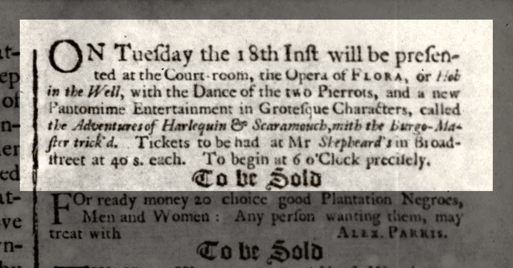 Due to popular demand or simply a lack of alternate material, Charleston’s nascent theatrical troupe repeated The Orphan at the Court Room on January 28th and again on February 4th. The third performance included the addition of a comic afterpiece, described in the newspaper as “a new pantomimic entertainment in grotesque characters, called, The Adventures of Harlequin and Scaramouch, with the burgo-master trick’d.”[11] This dance piece reflected English fascination with the Italian commedia dell’arte genre, and included a number of ensemble parts for actors flitting around the principal pair like a choreographed chorus. It was almost certainly a vehicle for Henry Holt, who had participated in London productions of the same piece one year earlier.[12]