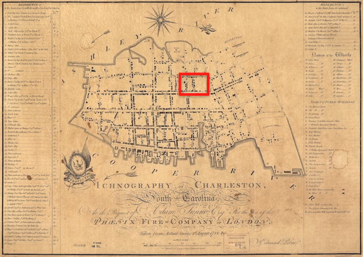 You can get a good sense of the physical context of Dutch Town by looking at a map called the “Ichnography of Charleston,” which was published in 1790 by the Phoenix Fire Insurance Company of London. This valuable map, which was based on surveys made in 1788, tells us that “Dutch Church Alley,” adjacent to St. John’s Lutheran Church, was thirteen feet wide, while Beresford Street was twenty-five feet wide. Those two short streets, running east-west between Archdale and King Streets, are the only streets in Dutch Town at that time.