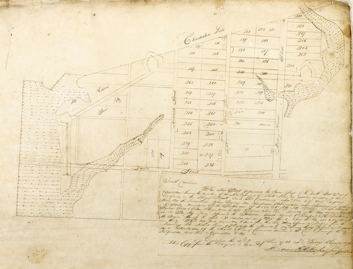 In the mid-1740s, engineers and laborers corrected this oversight by creating an earthen wall and moat, measuring nearly a half-mile in length and punctuated with at least three bastions, to protect the Charleston’s sparsely-populated northwestern frontier. At the same time as this large construction project, South Carolina’s surveyor general, George Hunter, re-surveyed all of the property west of Meeting Street and north of Queen Street, which at that time was almost entirely vacant. In June of 1746, Hunter completed his plat of re-survey, as he called it, that served as the new version of the Grand Model for the northwest portion of the town. The surveyor general’s original plat, created in 1746, does not survive, but the South Carolina Department of Archives and History in Columbia holds a “true copy” made in the 1820s by the state surveyor general, Daniel H. Tillinghast.