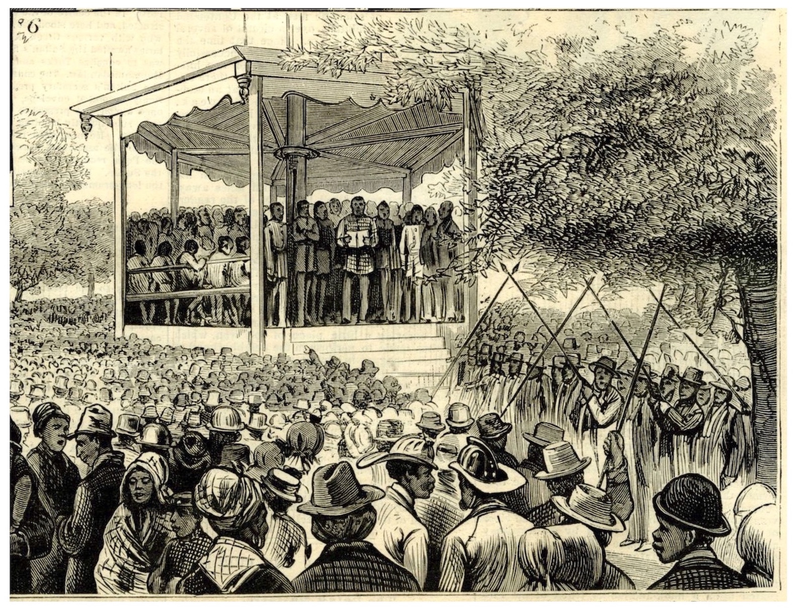 Practical emancipation came to the enslaved people of Charleston on 18 February 1865, when the Union Army occupied the city and then spread throughout the rest of the county (see Episode No. 163). Within the first year of post-war freedom, Charleston’s African-American community organized three large public celebrations. First, on 21 March 1865, thousands of newly-freed African Americans paraded through the streets of Charleston in a massive, jubilant celebration of the “death of slavery.” Several weeks later, on the first of May, a more somber parade led to a pastoral site on the city’s north side, where formerly-enslaved people decorated the graves of fallen Union soldiers. Finally, on the first day of January 1866, Charleston’s Black community staged a day of festivities in commemoration of the third anniversary of President Lincoln’s Emancipation Proclamation. This event was the first observance of its kind in Charleston, and it proved to be the cornerstone of an enduring tradition.