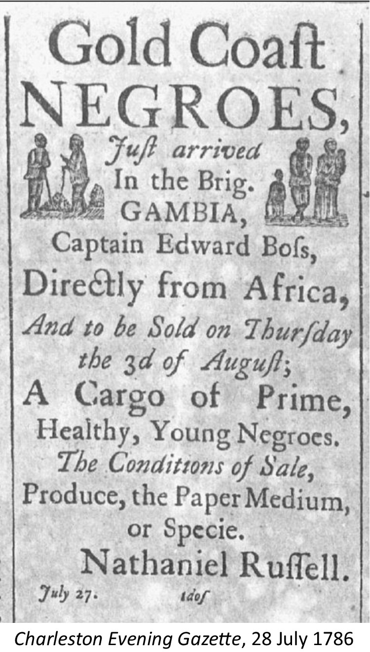 The American Revolution ended in the spring of 1783, when the British Parliament and the fledgling United States government signed peace treaties and then exchanged ratified copies across the Atlantic Ocean. The end of war meant the end of the Congressional ban on the trans-Atlantic slave trade, but few Americans expressed an appetite for that unsavory business. After a decade of passionate rhetoric about freedom, liberty, and unalienable human rights, many Americans, especially those in the Northern states, sought to distance themselves from the practice of slavery. At the same time, however, a number of eager capitalists were quickly outfitting vessels bound for Africa. Here in South Carolina, the first cargos of “new Negroes,” as they were called, began to arrive in Charleston harbor in the late summer of 1783.