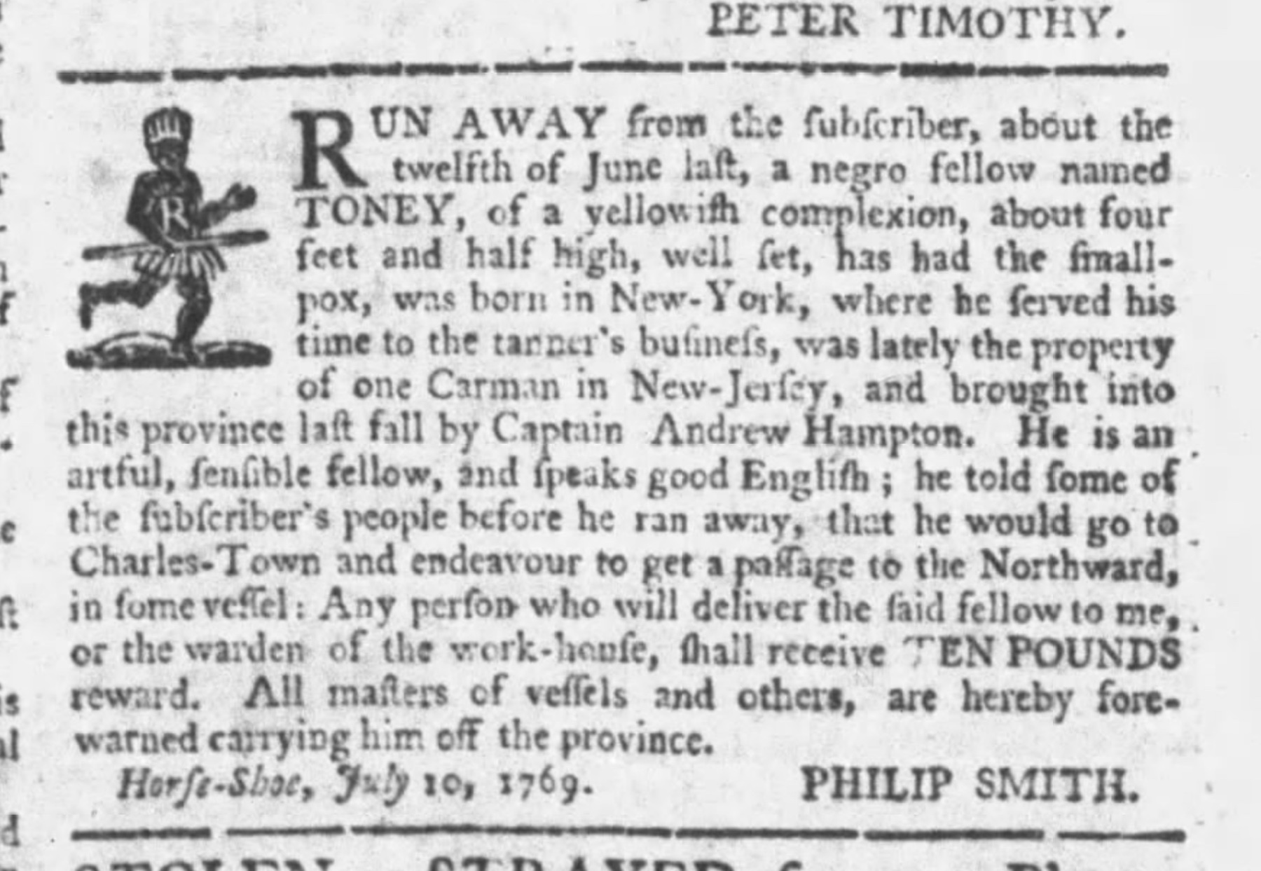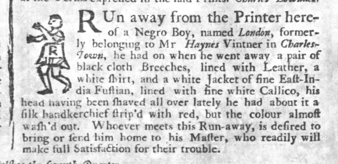 During my career as a student of South Carolina’s early history, I’ve spent a lot of time reading runaway advertisements printed in the newspapers of eighteenth- and nineteenth- century Charleston—not because I’m trying to become an expert on this topic, but because I find them irresistible. Every advertisement represents a fascinating snapshot of a long-forgotten individual who struggled to find peace and dignity within an oppressive situation. From a creative perspective, one could view each runaway advertisement as a miniature short-story, which an imaginative writer could extend into a compelling work of historical fiction. By following clues imbedded within the advertisements and mining other historical resources, it’s also possible to expand some of these newspaper snapshots into larger biographical sketches.