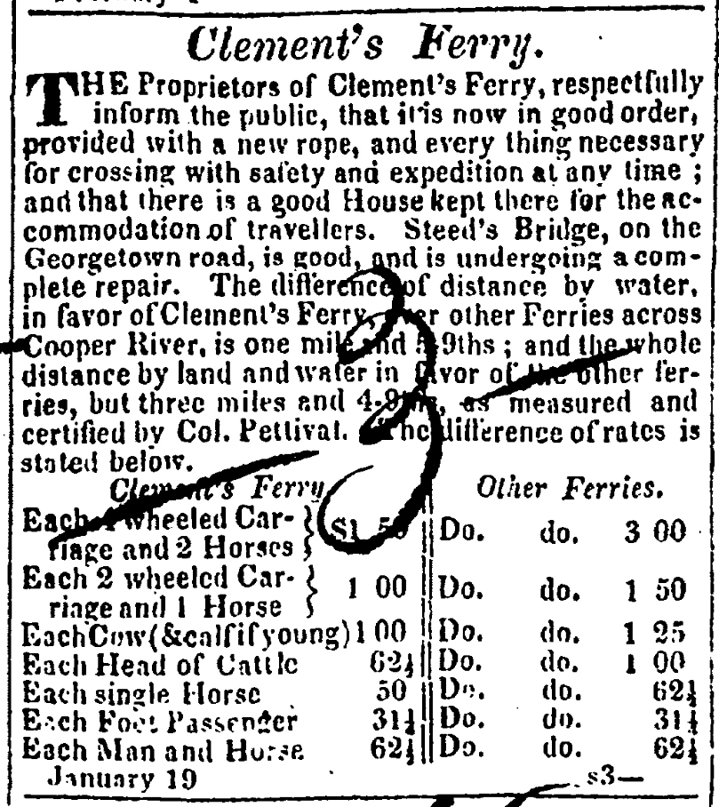 [24] See the advertisements for Milton Ferry in [Charleston] City Gazette, 17 November 1823, and Charleston Courier, 1 November 1830. See also the advertisements for Clement’s Ferry in Southern Patriot, 17 February 1832.