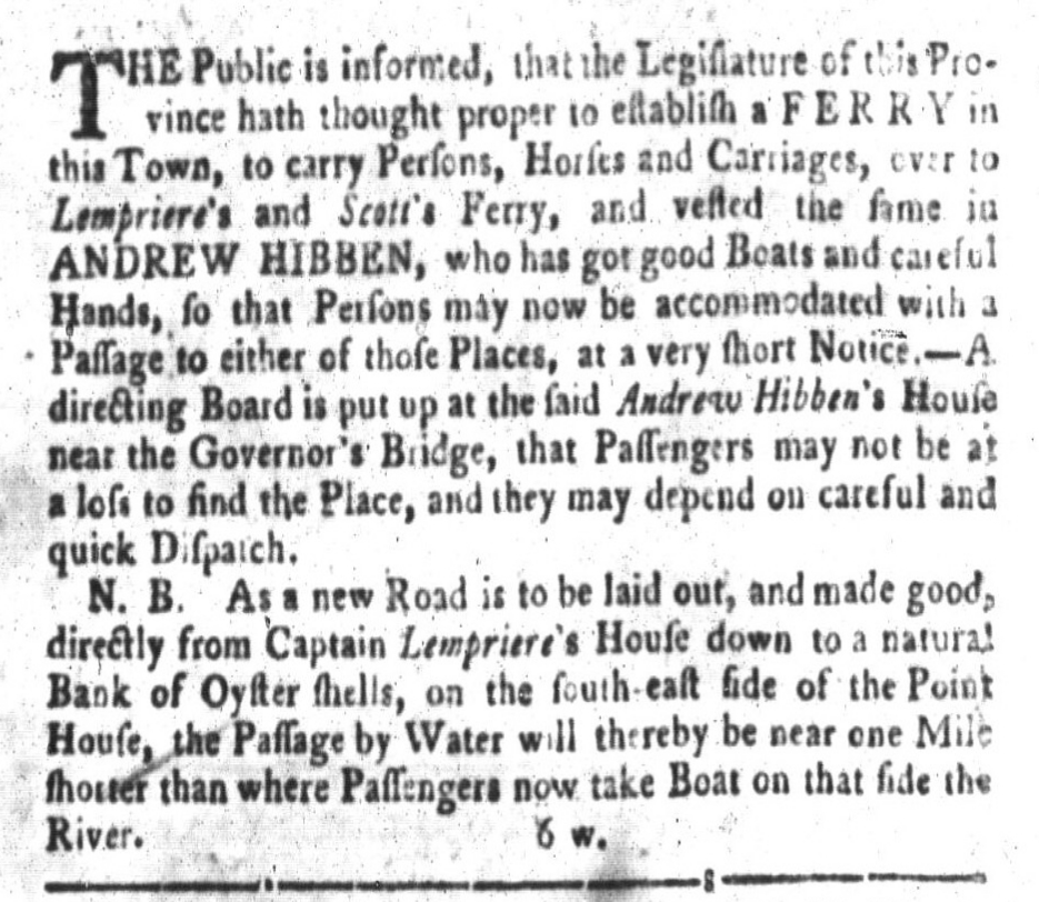 [11] In a notice published in South-Carolina and American General Gazette, 6–12 February 1772, William Tweed and William Harper announced that they had leased Hibben’s ferry service between Charleston, Hobcaw Point, and Scott’s Ferry.