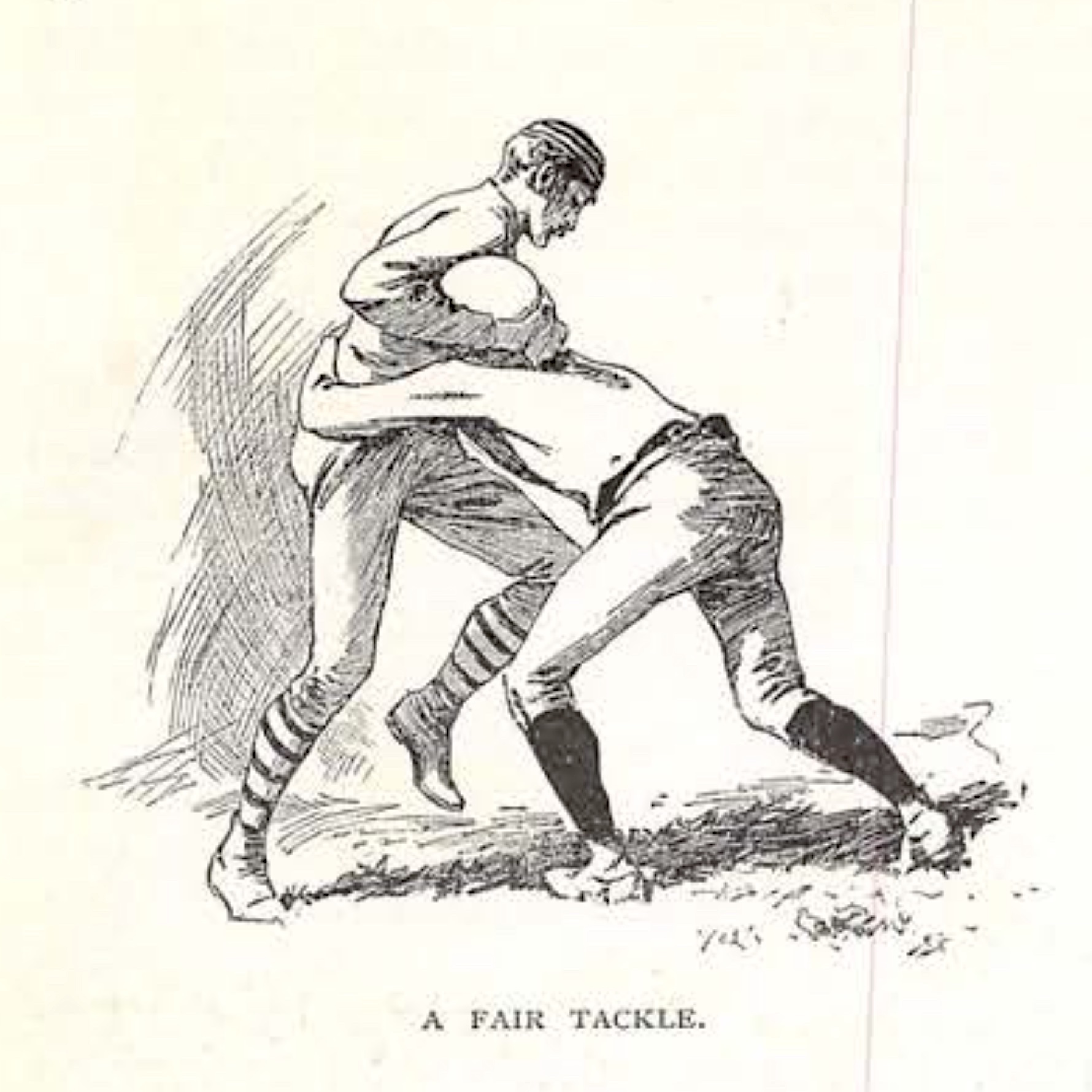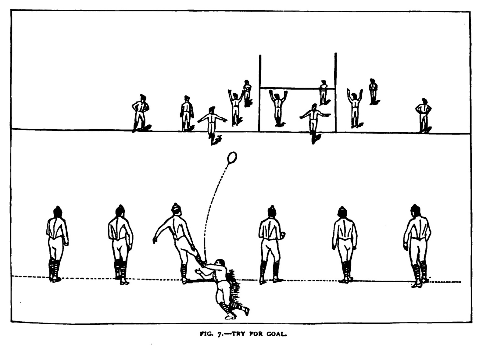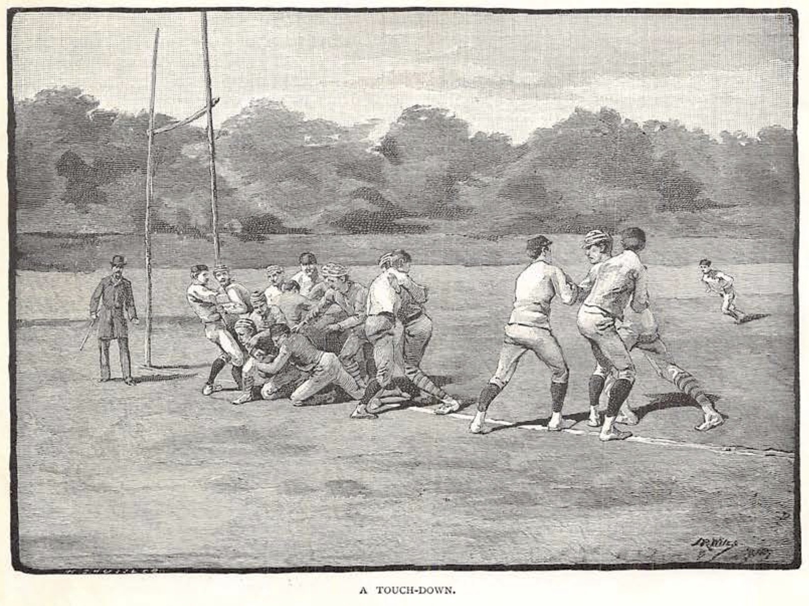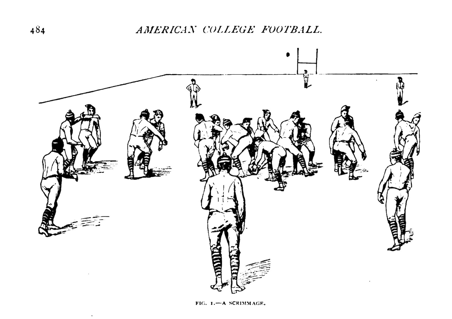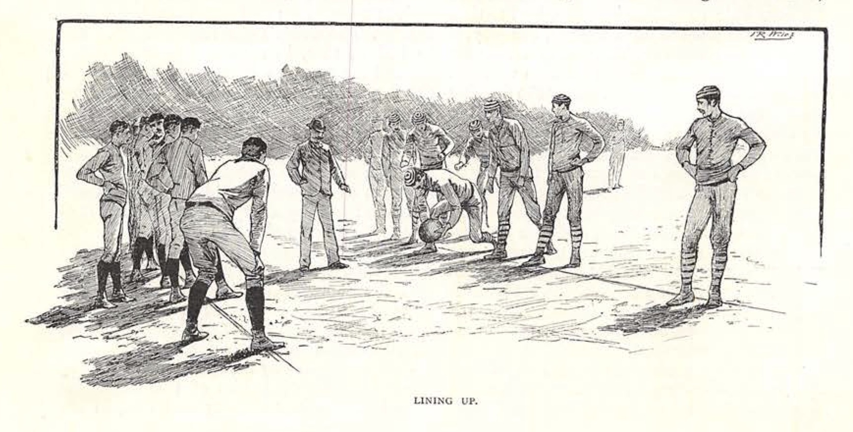American football of the late 1880s looked and sounded much like the modern game. After the opening kickoff, the team in possession of the ball formed a seven-man “rush line” at the line of scrimmage. The captain used hand signals or code words to communicate tactical instructions to his teammates. The “centre rusher” snapped the ball to the quarter-back, who either charged across the scrimmage line or transferred possession to a half-back or full-back using a hand-off, lateral toss, or a drop-kick to a forward receiver (the rules did not permit a forward pass over the line of scrimmage until 1906). The game’s scoring system included the familiar touch-down, conversion kick, field goal, and safety, but the number of points assigned to each differed from today’s game.[4]