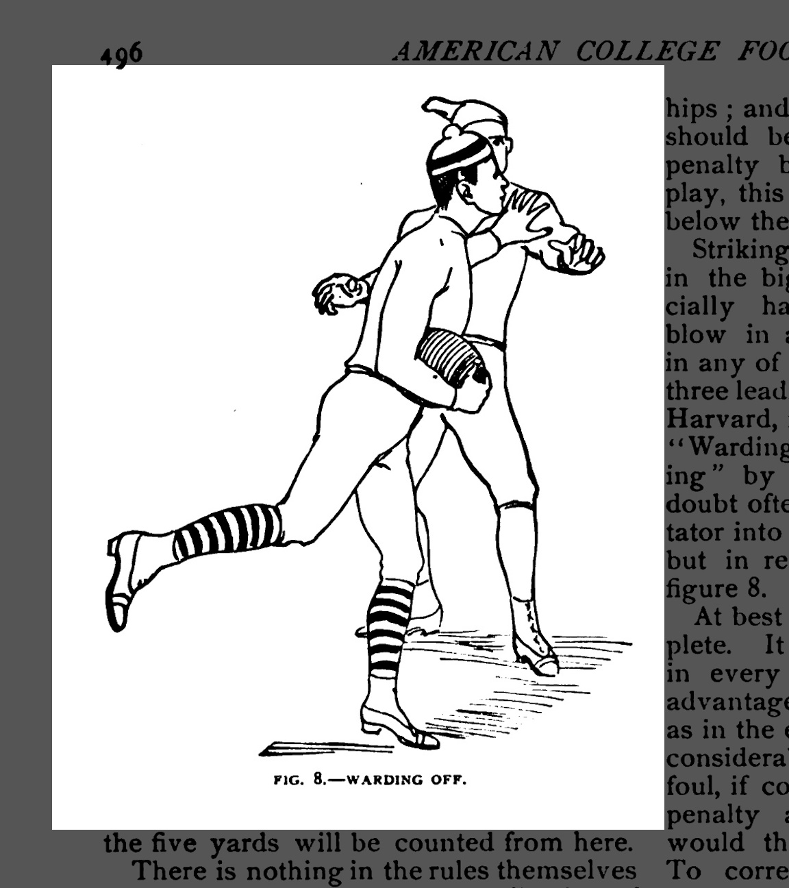 A crude but recognizable version of what we now call American-style football emerged from the intercollegiate rules adopted in October 1882. The most distinctive aspects of the game at that time were the use of a moving line of scrimmage, the concept of downs, and the requirement to move the ball forward a certain number of yards within four downs or concede possession of the ball. The latter innovation obliged teams to divide the field of play into five-yard increments, thus spawning the game’s distinctive “gridiron” field of play.
