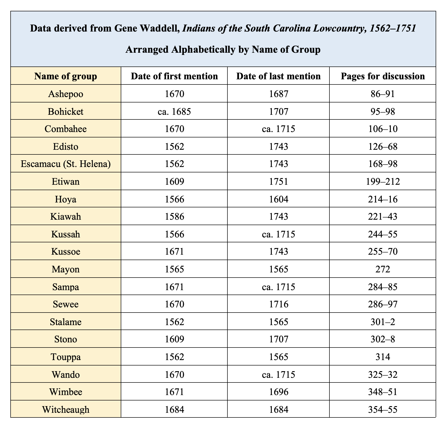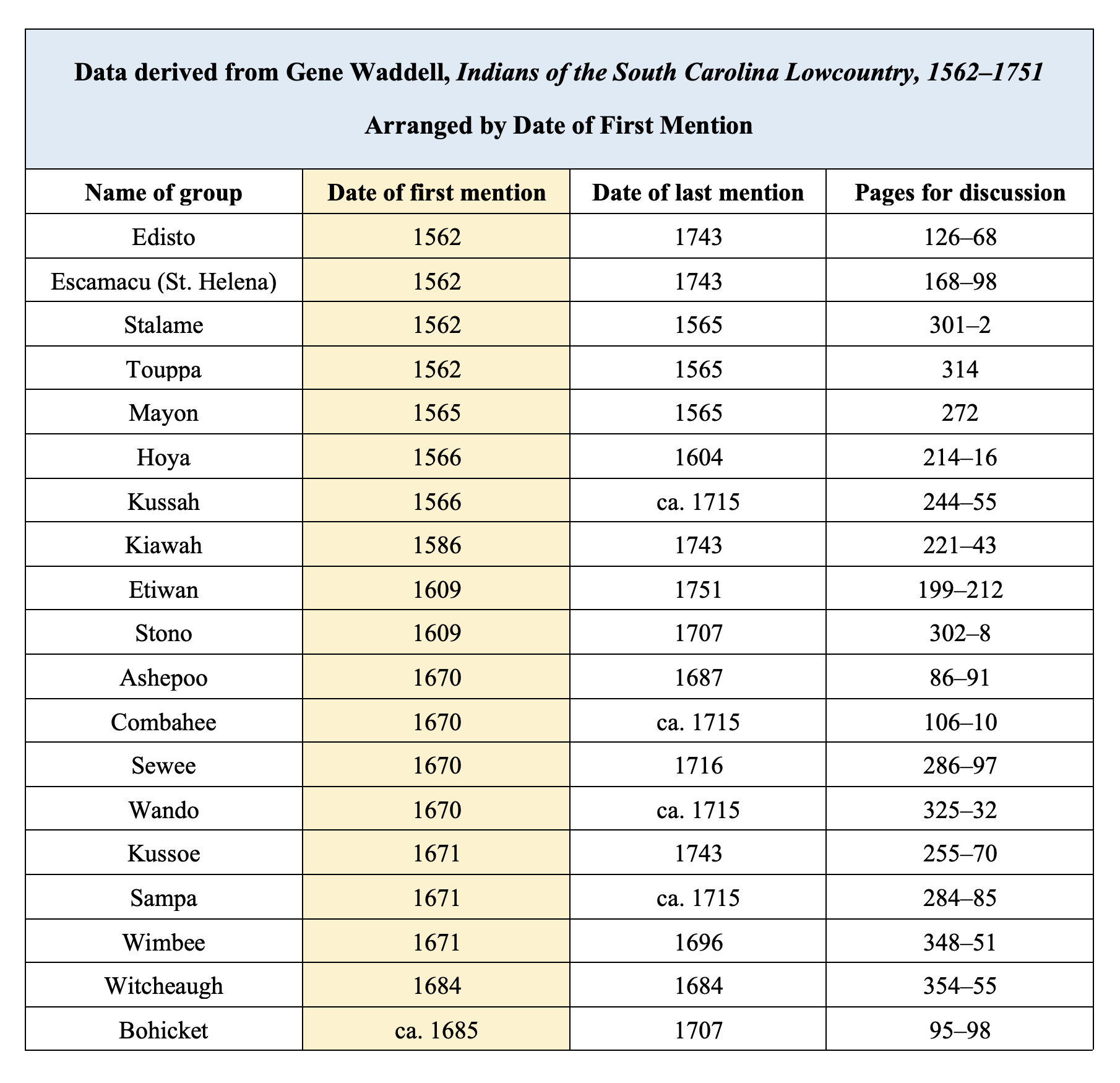 [1] For a discussion of the documentary evidence for the term “Cusabo,” see Gene Waddell, Indians of the South Carolina Lowcountry, 1562–1751 (Southern Studies Program, University of S.C., Columbia, S. C. 1980), 114–19.