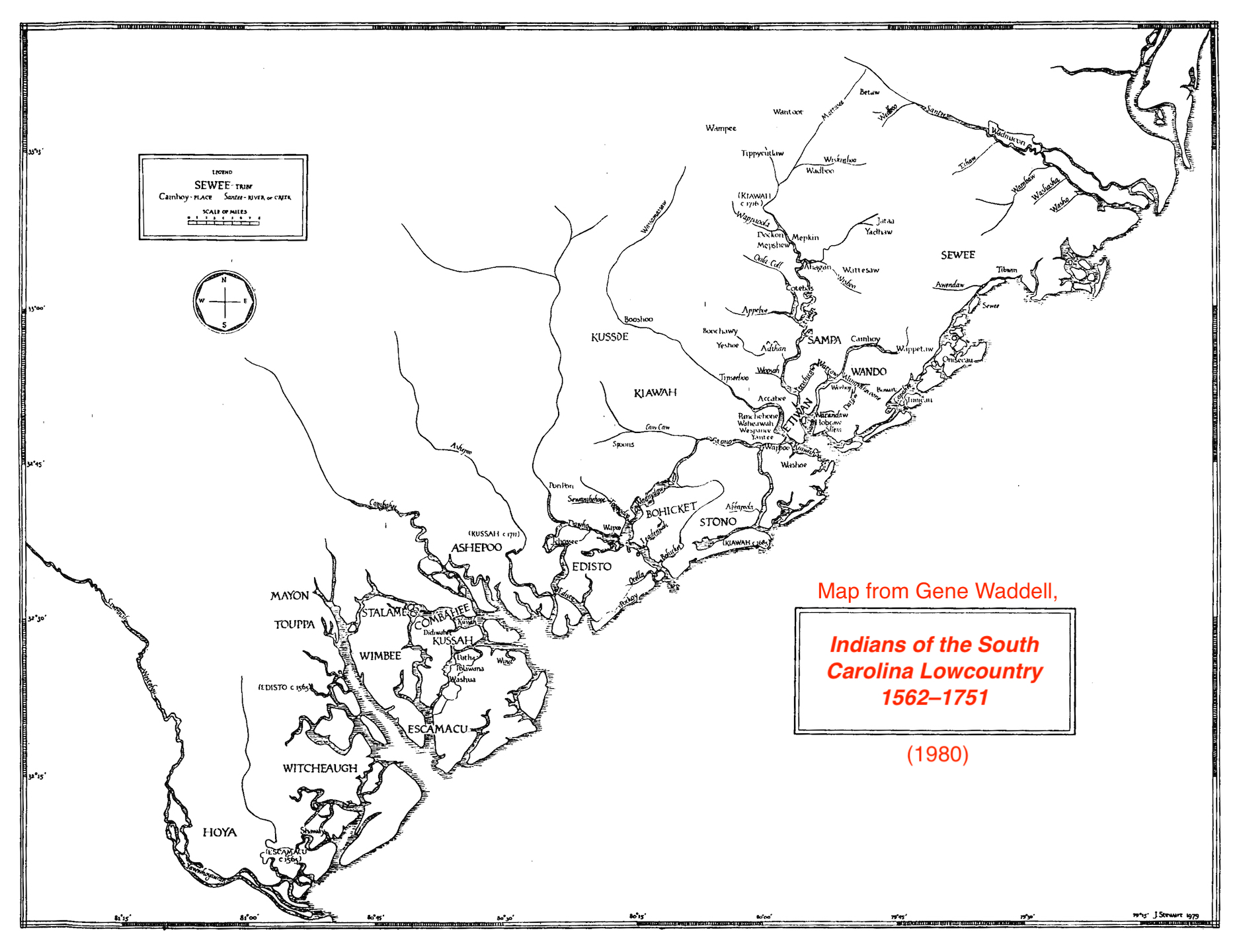 The geographic range of this conversation embraces what is commonly called the “Lowcountry” of South Carolina; that is, the coastal plain stretching approximately eighty miles inland between the Savannah River to the south and the Santee River to the North. Conveniently, this geographic range encompasses a landscape with a relatively homogenous history during the period of European exploration and colonization in centuries past. Both the Savannah and Santee Rivers appear to have formed cultural and political boundaries between the indigenous peoples that once inhabited this area and their neighbors to the south and north. The native people of the Lowcountry were also culturally and politically distinct from the inland tribes like the Catawba, Cherokee, Creek (Muskogean), Shawnee, and Chickasaw. Representatives of those larger, westerly groups certainly form part of the early history of South Carolina, but the seat of their respective histories lies beyond the Lowcountry and beyond the scope of the present conversation.